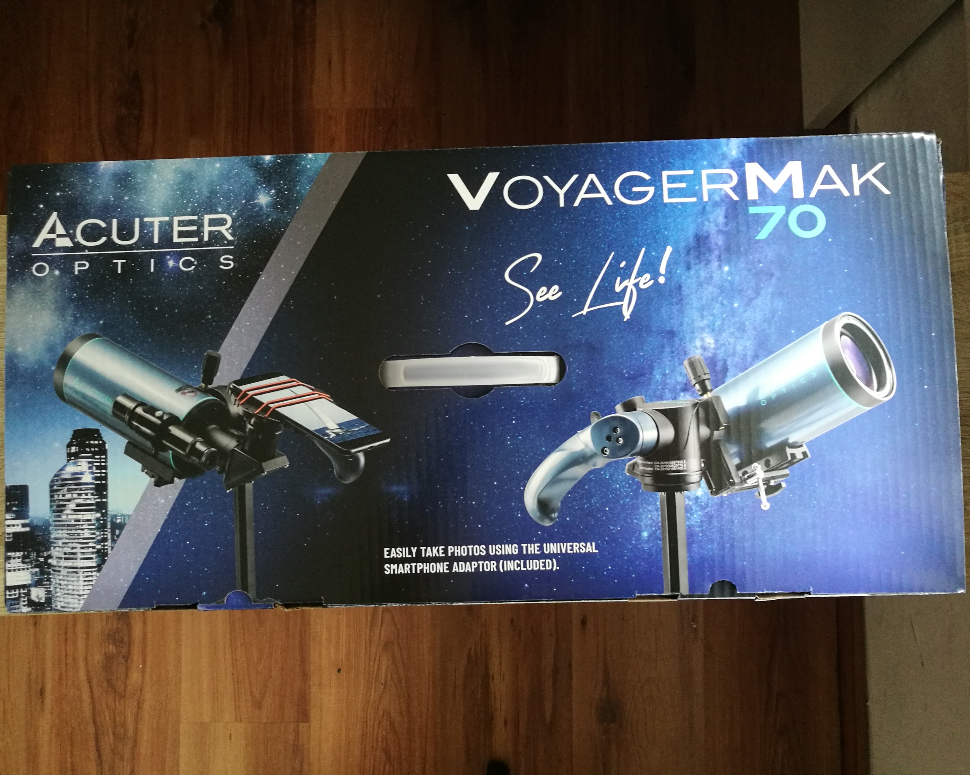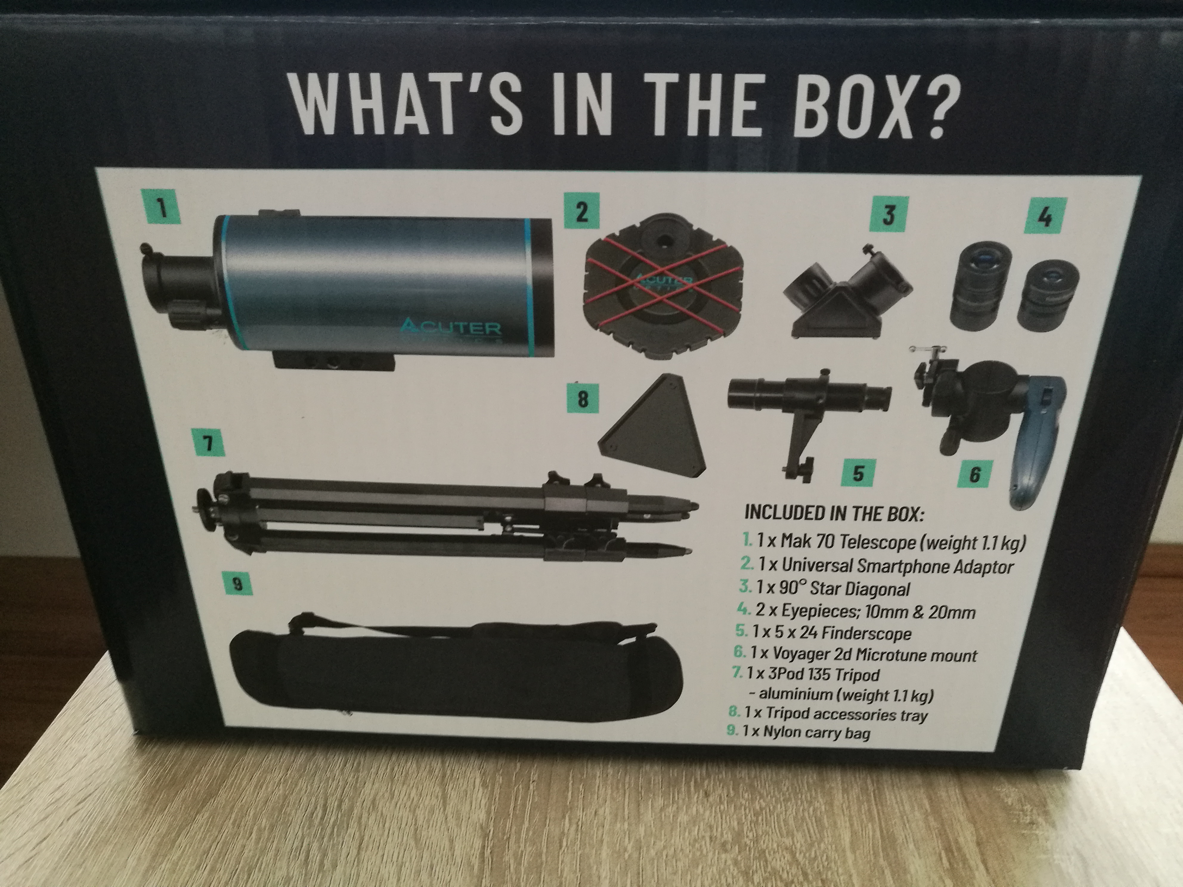 Das Teleskop selbst ist sehr kompakt, der Tubus ist lediglich 26cm lang, ideal zum Transport und wenn der Platz knapp ist. Maksutov Cassegrains liefern ein sehr gutes, kontrastreiches Bild, das zudem frei von Farbfehlern ist! Zwei Okulare gehören zum Lieferumfang, man erreicht damit 50- und 100-fache Vergrößerung. Erstere ist gut um Himmelsobjekte aufzufinden oder um die Landschaft zu beobachten, letztere eignet sich schon gut, um feine Einzelheiten am Mond oder den Planeten zu sehen, z.B. die Phasen der Venus oder die Wolkenbänder des Jupiter. Mit optionalen Okularen kann die Vergrößerung auf bis zu 140-fach ausgebaut werden. Ein Zenitspiegel wird natürlich ebenso mitgeliefert, er ermöglicht die bequeme Beobachtung auch von hoch stehenden Himmelsobjekten.
