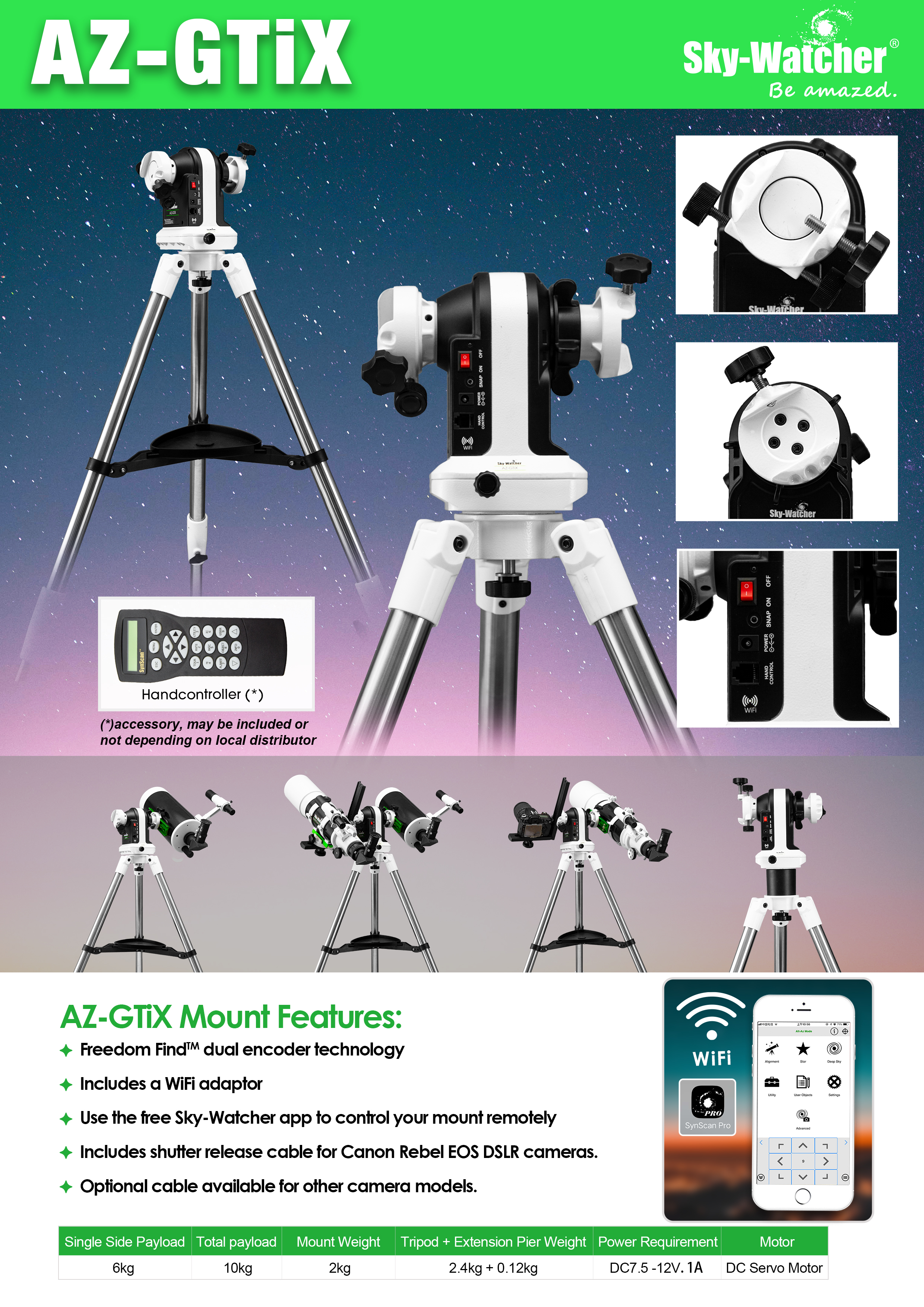 Mit der inkludierten Winkelhalterung ist sogar die Befestigung von einer Kamera oder einem längeren Teleskop (<6kg) möglich. Ein Auslösekabel für Canon EOS DSLR Kameras ist ebenfalls im Lieferumfang inkludiert.