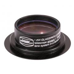 Bei diesem Glaswegkorrektor® darf die Fassung nicht geöffnet, werden weil die Linsen beim Einbau einzeln zentriert und die Linsenabstände auf maximale Leistung als Glaswegkorrektor (nicht aber als Barlowlinse!) optimiert wurden. Deshalb steht nur die "Linsenstellung B" zur Verfügung (vgl. Infoblatt zum Astro T-2 System®). Der Glaswegkorrektor® mit Faktor 2,6 lässt sich in jedes T-2 Zenitprisma oder T-2 Amici-Prisma oben direkt einschrauben und so auch direkt vor dem Großfeld-Binokular einbauen.