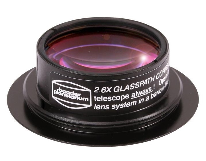 Bei diesem Glaswegkorrektor® darf die Fassung nicht geöffnet, werden weil die Linsen beim Einbau einzeln zentriert und die Linsenabstände auf maximale Leistung als Glaswegkorrektor (nicht aber als Barlowlinse!) optimiert wurden. Deshalb steht nur die "Linsenstellung B" zur Verfügung (vgl. Infoblatt zum Astro T-2 System®). Der Glaswegkorrektor® mit Faktor 2,6 lässt sich in jedes T-2 Zenitprisma oder T-2 Amici-Prisma oben direkt einschrauben und so auch direkt vor dem Großfeld-Binokular einbauen.
