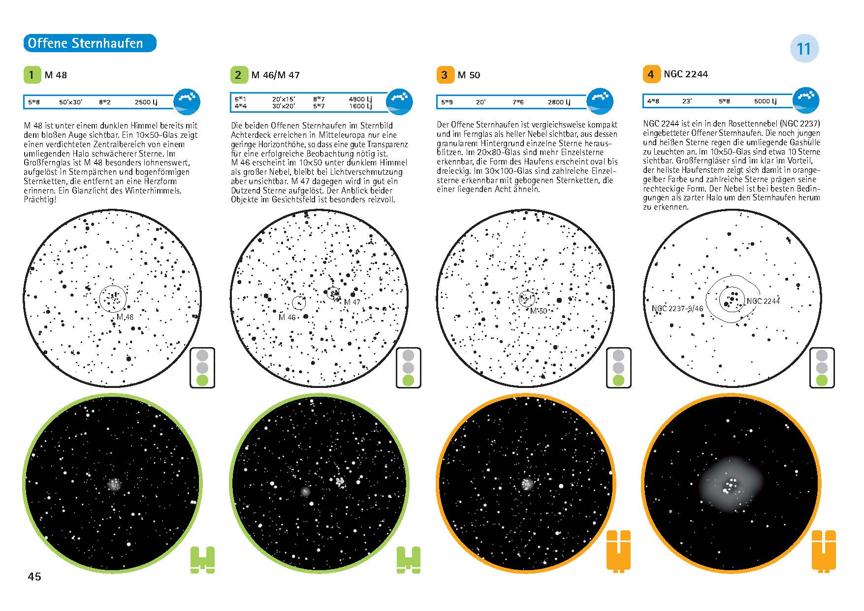 - Aufsuchkarten mit Gesichtsfeldern von 6° für Handferngläser und 3° für Großferngläser