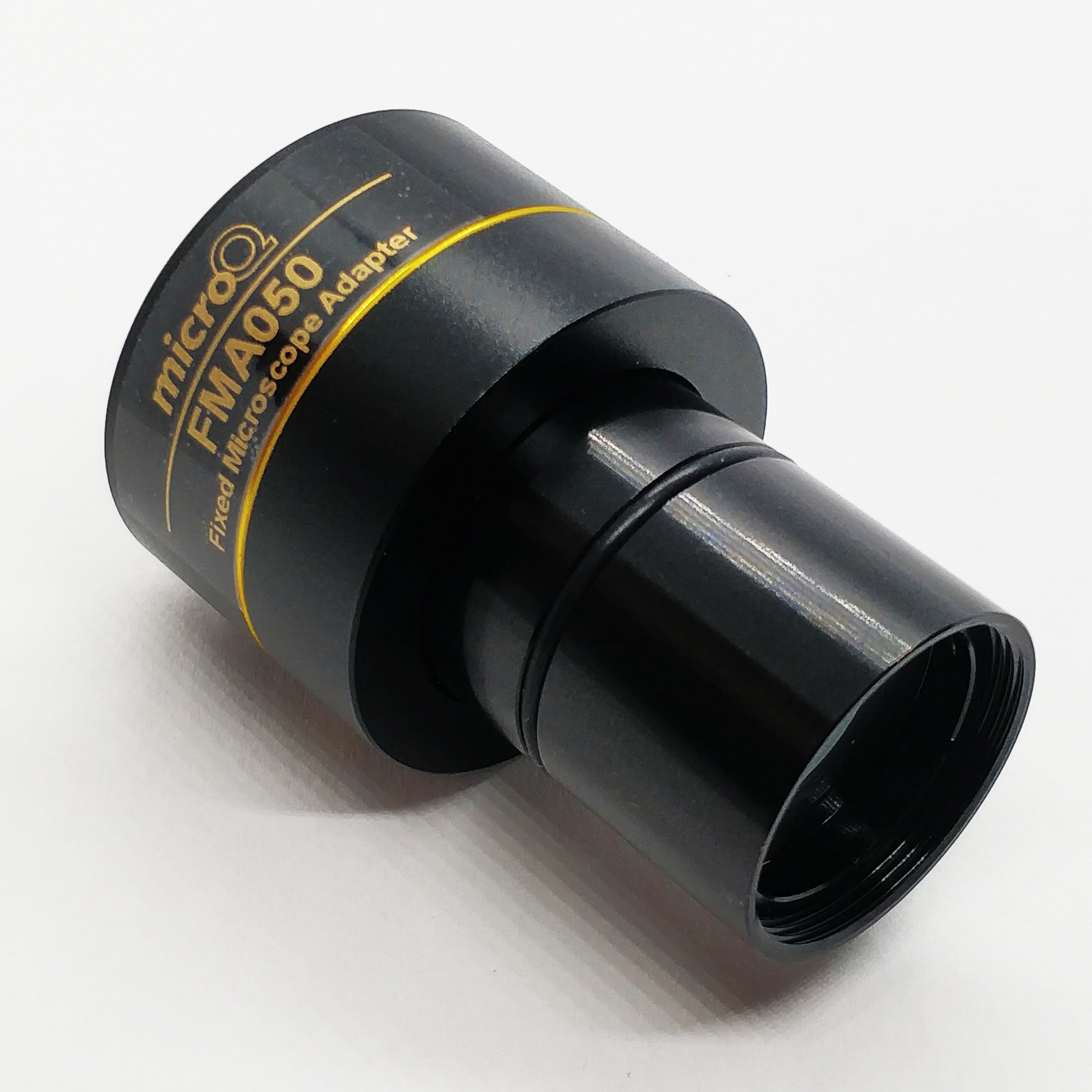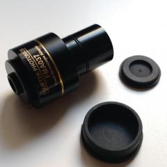 Dieser für Mikrposkope entwickelte Projektionsadapter wurde für C-Mount Kameras angepasst. Mit seinem 0,5x Faktor bildet die in 10x Okular sichtbares Bild (gewöhnlich 18-20mm Durchmesser) an eine Sensorgröße von 1/2,5" (Bilddiagonale 10mm) ab. In einem C-Mount Kamera geschraubt, wird parfokal mit einem Mikroskopokular sein: das heisst, man entfernt den optischem Okular und steckt den Fotoadapter mit C-Mount Kamera einfach um, ohne grob nachfokussieren zu müssen. Feinfokussierung ist immer notwändig.