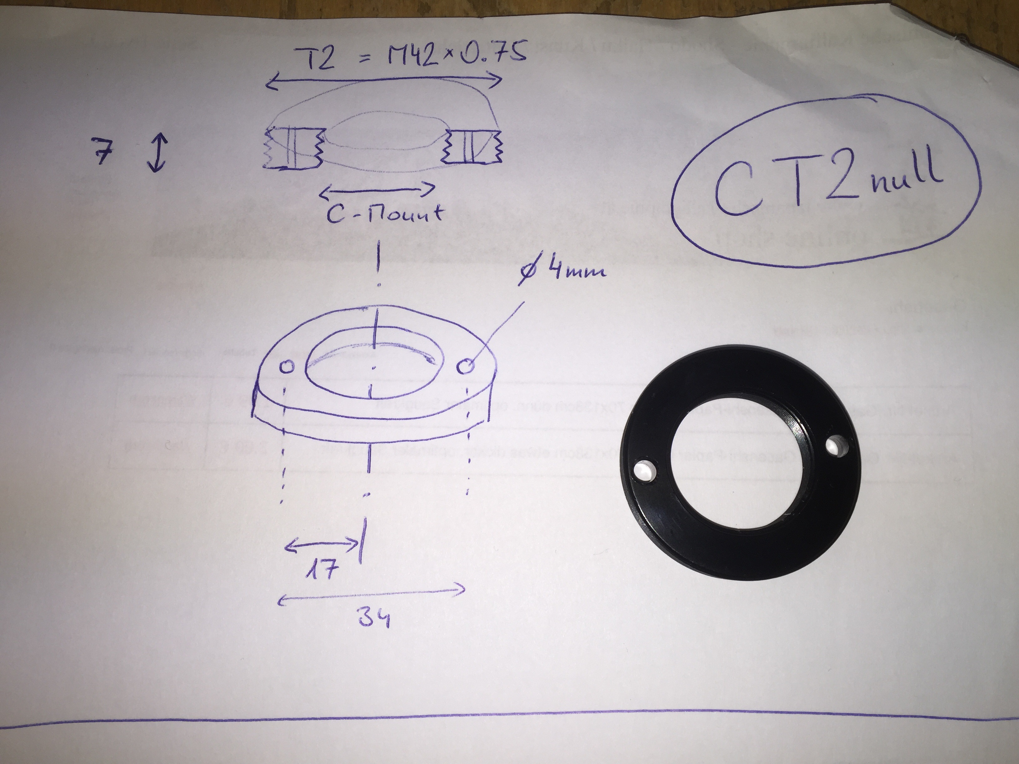 Adaptor C Mount (internal thread) to T2 (external thread) with zero optical path
