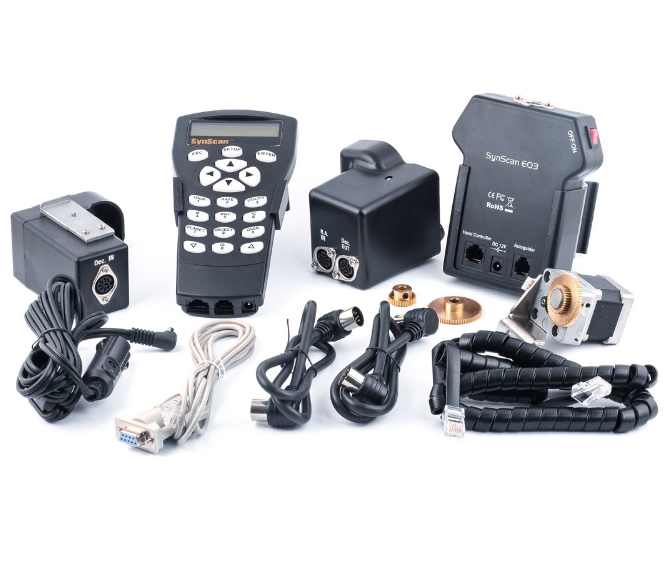 Mit dem EQM-35 SynScan Goto Upgrade-Kit kann die manuelle EQM-35 Montierung zur vollautomatischen Goto-Montierung aufgerüstet werden. Das Kit beinhaltet zwei hochwertige Schrittmotoren, eine Zentraleinheit, die SynScan Handbox in der neuesten Version mit USB-Anschluss und alle nötigen Kabel. Die Zentraleinheit verfügt über einen Autoguider-Anschluss, damit ist man für Langzeit-Fotografie bestens gerüstet. Als Stromversorgung werden 12V benötigt, das Netzteil sollte mindestens 3A liefern, wir bieten leistungsstarke Netzgeräte als Zubehör an, siehe unten beim empfolenen Zubehör.
