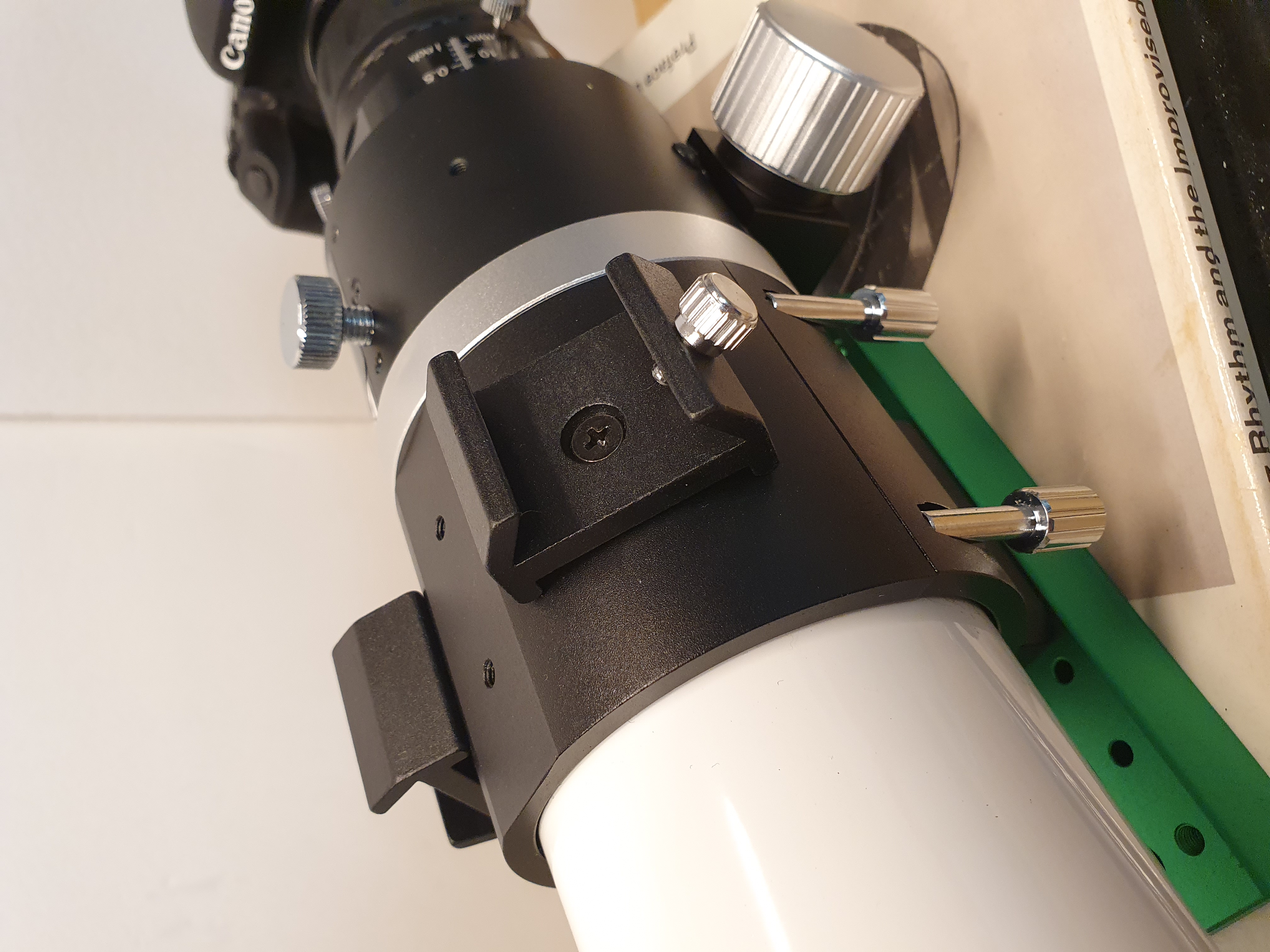 45mm dovetail bar, clamshell ring, and adjustable dew shield.