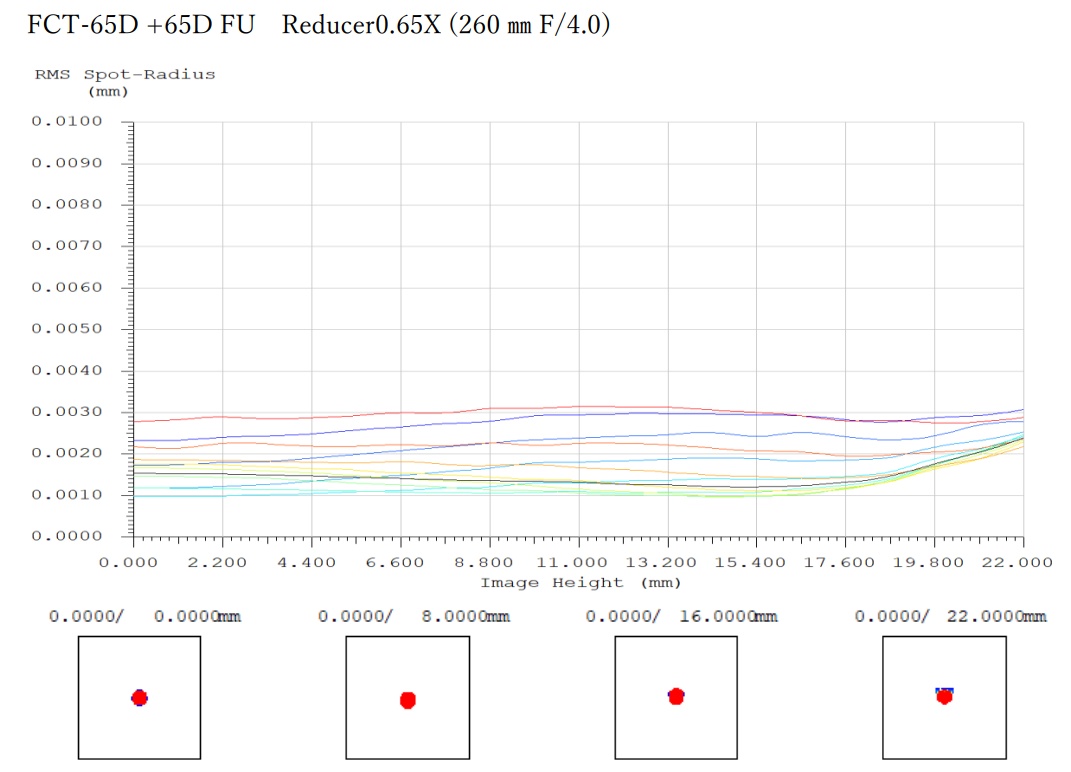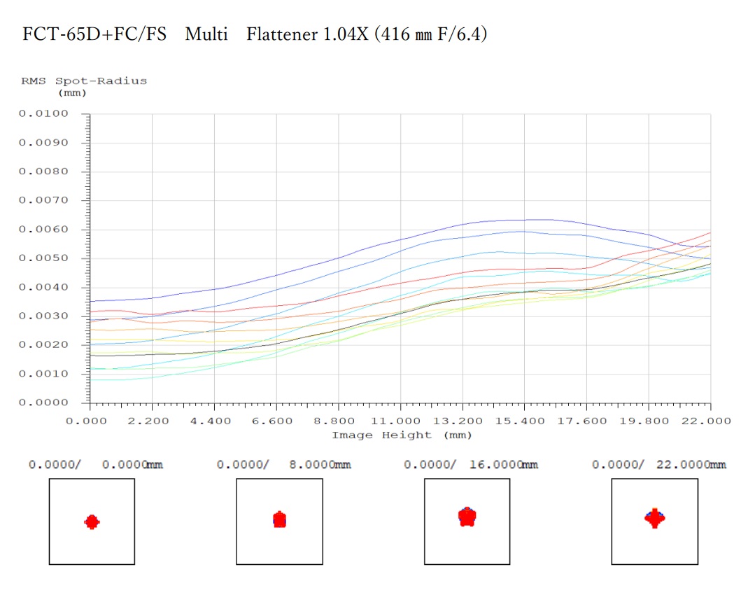 Takahashi empfiehlt den Tubus des FCT-65 nicht zu zerlegen, die Kollimation könnte darunter leiden! Die drei hinteren Tuben der Geräte FS-60CP, FCT-65D und FC-76DP sind ident, ein Wechsel der Objektive ist jedoch nur beim FS-60CP bzw. FC-76DP empfohlen! Für Kunden die die beste Optik mit den kleinsten Spots suchen, empfehlen wir den FCT-65D! Sucht man jedoch eine vielseitige Optik (z.B. weil Q-Modul oder FC76-Objektivmodul bereits vorhanden sind), erscheint uns der FS-60CP sinnvoller. Die simulierten RMS-Spotgrößen beim FS-60CP mit neuen Reducer sind etwa 6µm, beim FCT-65D mit Reducer maximal 4µm, vor allem im blauen Licht performt er besser.