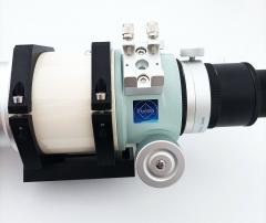 Völlig neue Wege beschreitet Takahashi bei der mechanischen Konstruktion. Der Auszug wurde vom Sky-90 übernommen und stellt praktisch den dicksten Teil des Teleskops dar. Das ist notwendig, um den optionalen Reducer aufnehmen zu können, er wird weitgehend im Okularauszug versenkt. Der große Auszug ist jedoch ein willkommener Pluspunkt, er verträgt mehr Zuladung als die kleineren Auszüge des FOA-60 und FS-60. Sehr erfreulich ist zudem, dass er nun bereits werkseitig über einen 2 Zoll Anschluss verfügt. Die Mikrountersetzung MEF-3 kann nachgerüstet werden.
