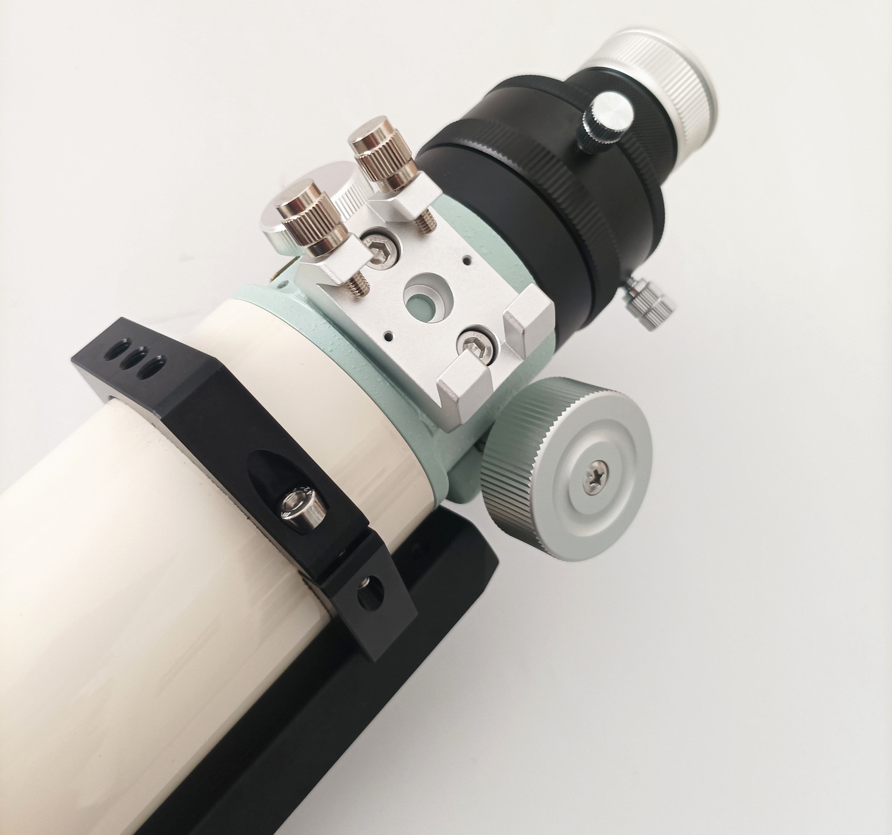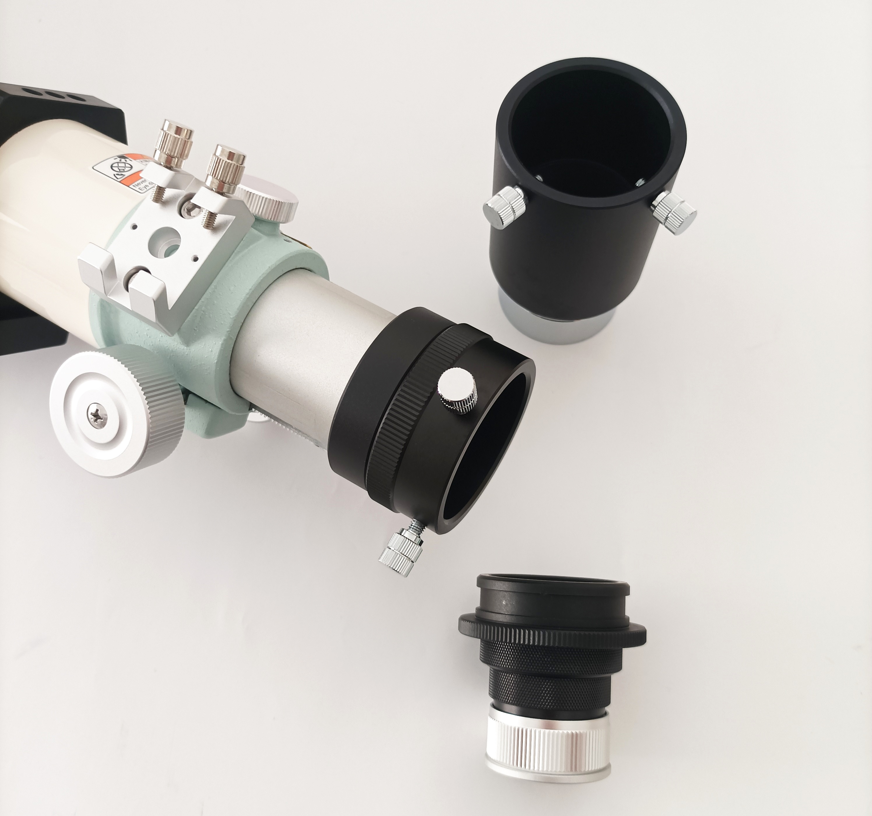 Auch mechanisch überzeugt dieses Gerät in jeder Hinsicht. Die Taukappe kann eingeschoben werden, schraubt man sie von ihrem Ring ab, kommt man von hinten an den äußeren Rand der Objektiv-Zelle, hier findet man die Justierschrauben (3x Zug- und 3x 2 Druckschrauben). Es ist sehr lobenswert, dass auch bei so kleinen Geräten eine Justier-Möglichkeit in der Konstruktion berücksichtigt wurde. Am Okularauszug hat man nun bereits werkseitig einen 2 Zoll Anschluss.