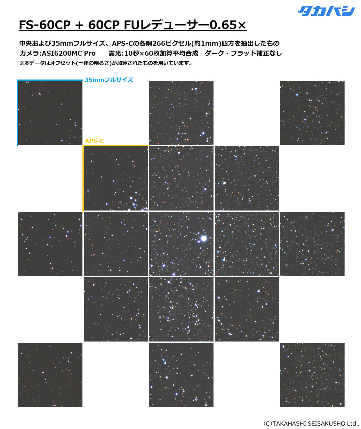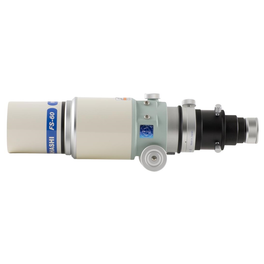 Takahashi hat für das bewährte FS-60 Objektiv einen Hochleistungsreducer konstruiert, dieser hat eine größere Dimensionierung des Tubus und des Okularauszuges erfordert. Der 4-linsige FU Super-Reducer x0.65 mit einem Fluorit-Element reduziert die Brennweite auf nur 230mm (f/3.8), bei perfekter Abbildungsleistung bis Vollformat, etwa 3 Mikrometer Spots über das gesamte Bildfeld!
