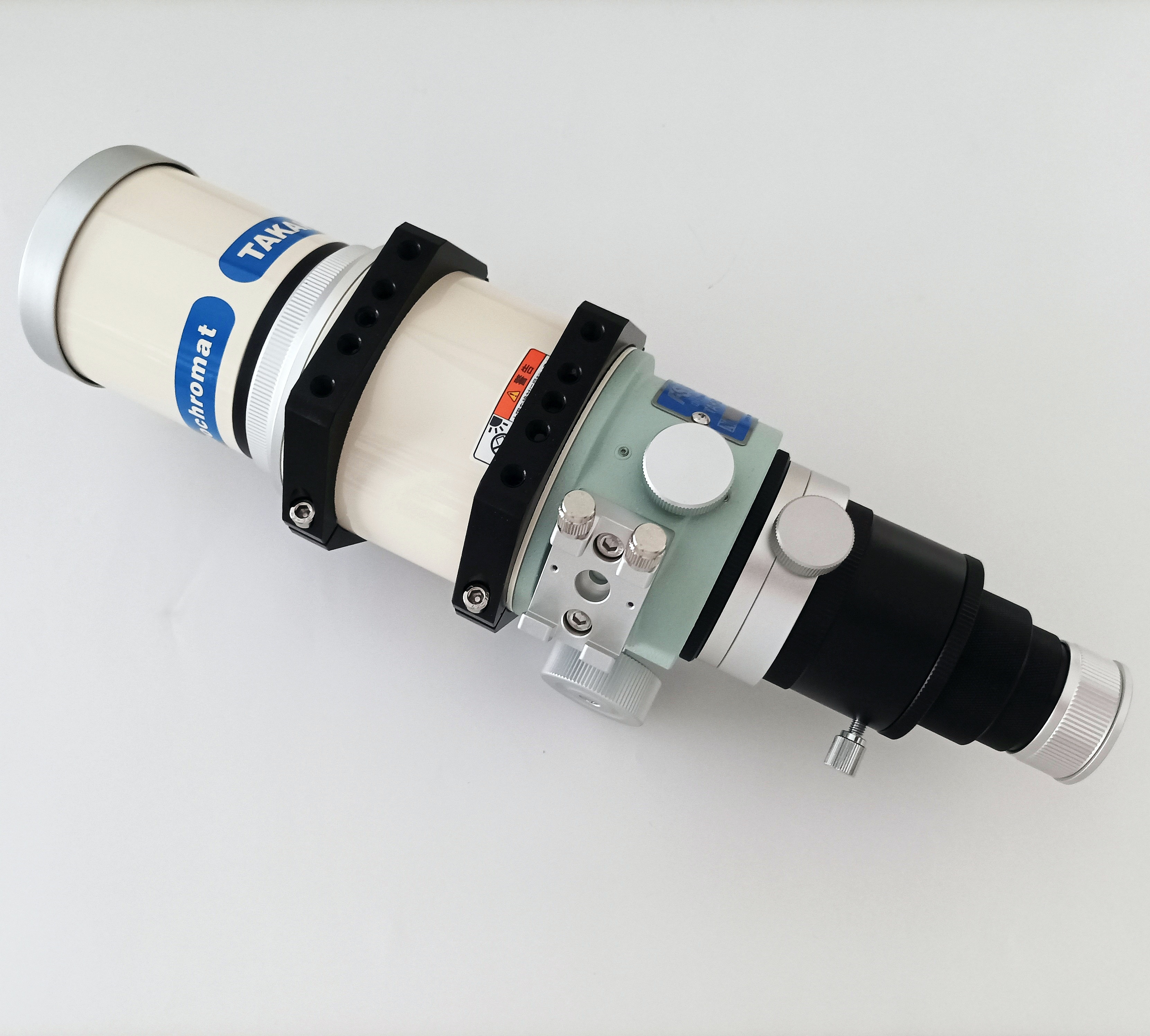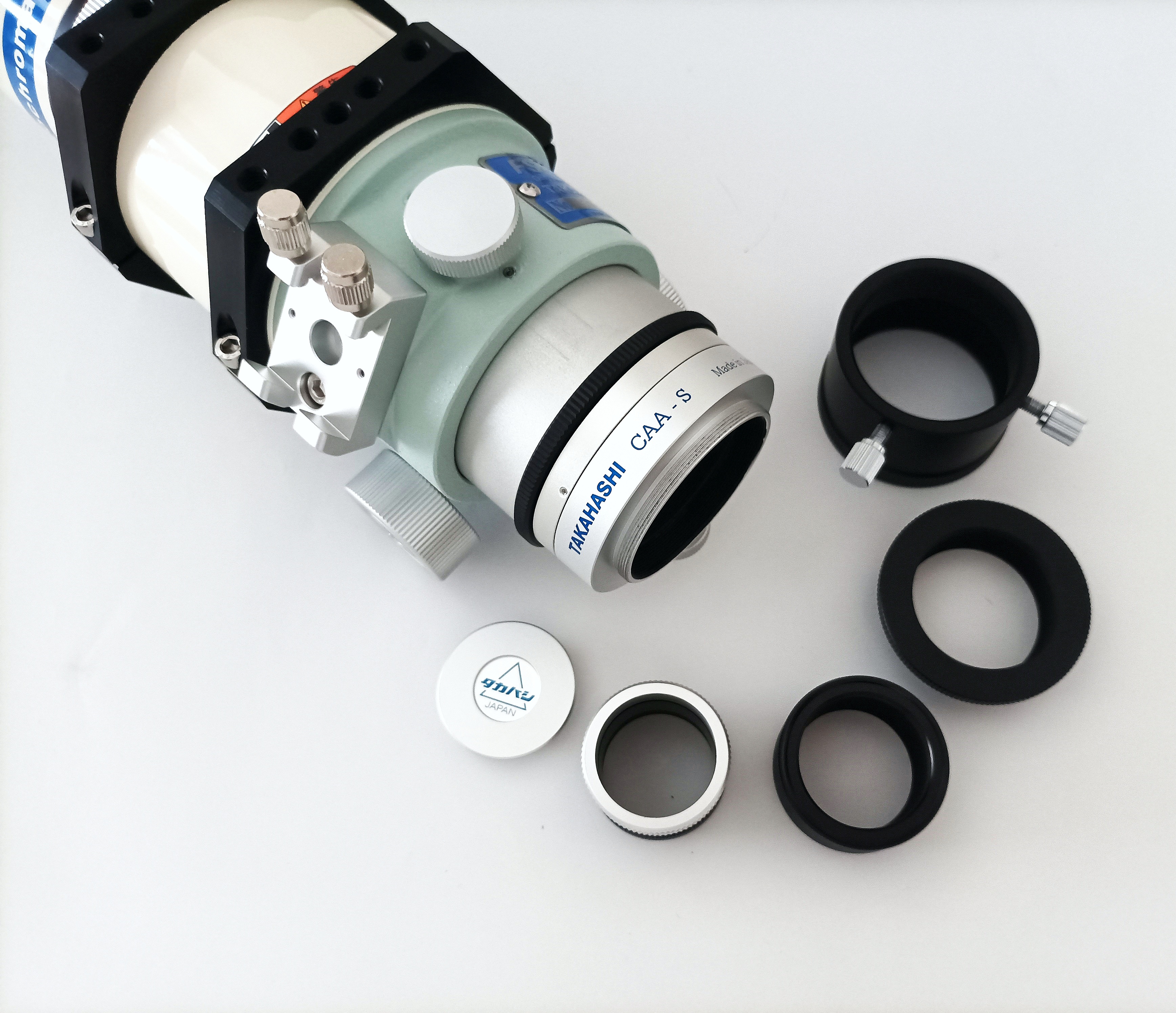 Der praktische Bildfeldrotator CAA-S ist beim Tubus schon enthalten, er kann natürlich bei allen fotografischen Kombinationen verwendet werden, auch beim großen Fluorit-Reducer. Jedoch macht er auch visuell Sinn, so kann der Zenitspiegel ganz einfach in die bequemste Position gedreht werden. Am Auszug können Takahashi-Sucher montiert werden, mit der kupTak-Klemme können auch welche anderer Hersteller befestigt werden. Der Auszug ist mit der MEF-3 Untersetzung nachrüstbar.