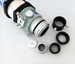 Auch beim FS-60CP kann der Extender CQ 1.7x des FS-60 (TKA20595) nachgerüstet werden. Es kommt wie gewohnt zwischen Objektiv und hinteren Tubus, der geriffelte silberne Ring verbleibt am Tubus. Man hat dann einen FS-60Q mit großem Auszug. Das Objektiv und das Q-Modul sind sehr leicht, daher können die Rohrschellen auch weiterhin am hinteren, dickeren Rohr befestigt werden. Optisch ist diese Version dem normalen FS-60 überlegen, das Q-Modul reduziert die sphärische und chromatische Aberration und ebnet zusätzlich auch das Bildfeld, da ist dann auch kein Flattener mehr nötig.