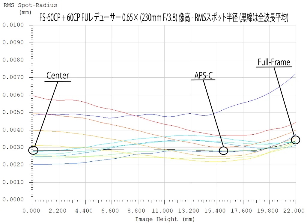 Takahashi hat für das bewährte FS-60 Objektiv einen Hochleistungsreducer konstruiert, dieser hat eine größere Dimensionierung des Tubus und des Okularauszuges erfordert. Der 4-linsige FU Super-Reducer x0.65 mit einem Fluorit-Element reduziert die Brennweite auf nur 230mm (f/3.8), bei perfekter Abbildungsleistung bis Vollformat, etwa 6 Mikrometer Spots über das gesamte Bildfeld (simulierte RMS-Werte)!