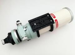 Der FSQ-106EDX4 ist mit einem großzügig dimensionierten 4 Zoll Zahnstangen-Auszug ausgestattet, der auch für schwere Zuladungen mit großen gekühlten Kameras samt Filterrad geeignet ist. Da bei einem so schnellen Öffnungsverhältnis eine genaue Fokussierung besonders wichtig ist, ist er bereits werkseitig mit einer Mikrountersetzung ausgerüstet. Der Auszug ist nicht rotierbar und fest mit dem Tubus verschraubt, was Kollimationsprobleme im Ansatz vermeidet. Die Rotation der Kamera erfolgt nur über den externen Rotator, sie ist dabei spielfrei und dennoch leichtgängig, Gewinde am Ende des Rotators: M98x1. Der Fokusierweg ist mit 30mm nicht sehr groß, bitte schließen Sie das Zubehör immer genau nach Systemdiagramm an! Alle Adapter sind bei uns im Webshop gelistet, das Wunsch-Setup kann einfach selbst zusammengestellt werden.