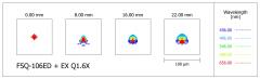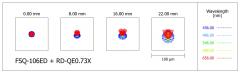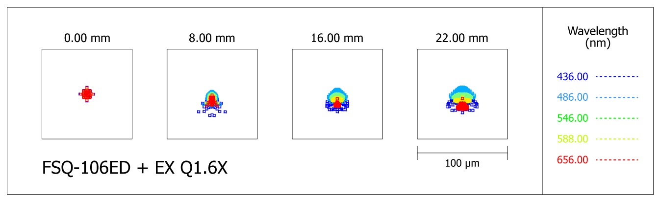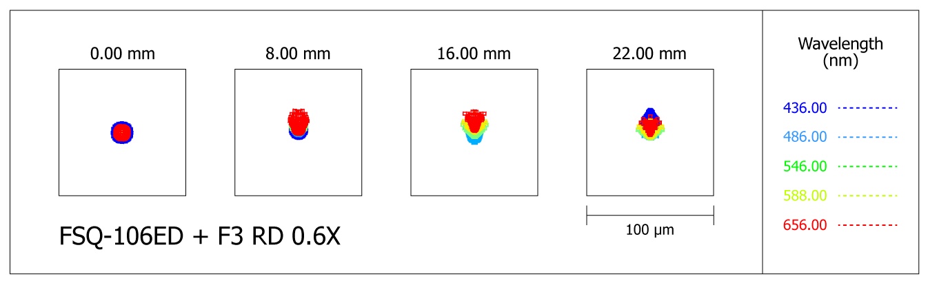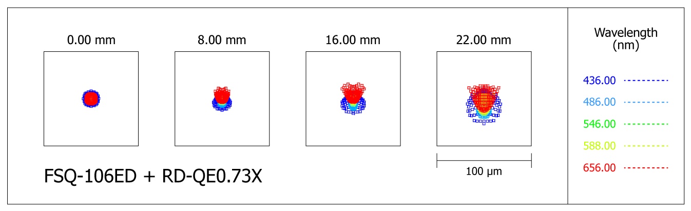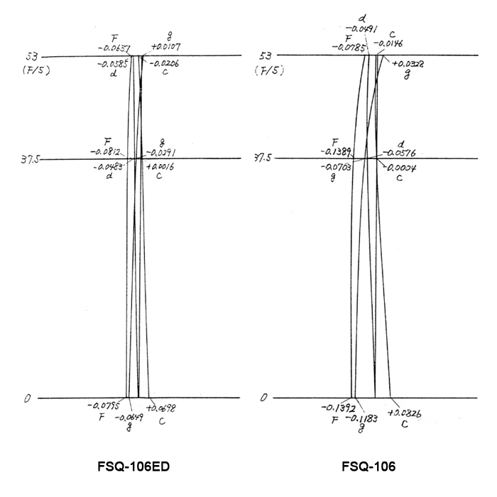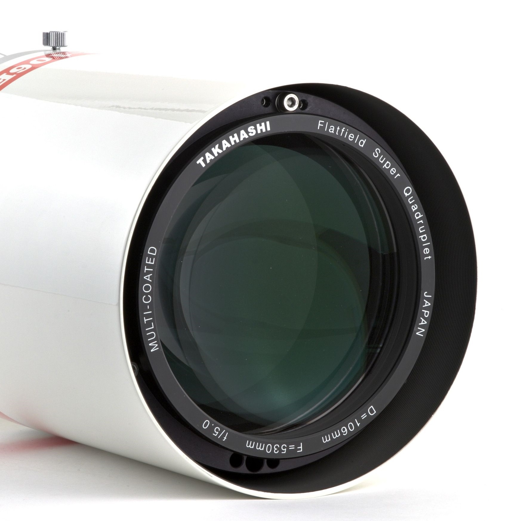 fest im Tubus verbaut und in 4 Gruppen angeordnet, bei 2 Linsen wird ein ED-Glas verwendet. Im Vergleich zum alten FSQ-106 Fluorit, konnte die chromatische Aberration nochmals reduziert werden. Auch die Sphärochromasie ist deutlich besser, er arbeitet wie auch die "langsameren" TOA-Objektive vom nahen Ultraviolett-Bereich bis ins Infrarote bei zirka 1000nm absolut zufriedenstellend. Diese höhere Korrektur wurde neben der Verwendung von den besten ED-Gläsern, unter anderem dadurch erreicht, dass die dritte Linse nun näher beim Objektiv liegt und so ein höheres Maß an Korrektur möglich ist. Sie ist 50% größer als beim Vorgänger und ermöglicht auch eine bessere Ausleuchtung.