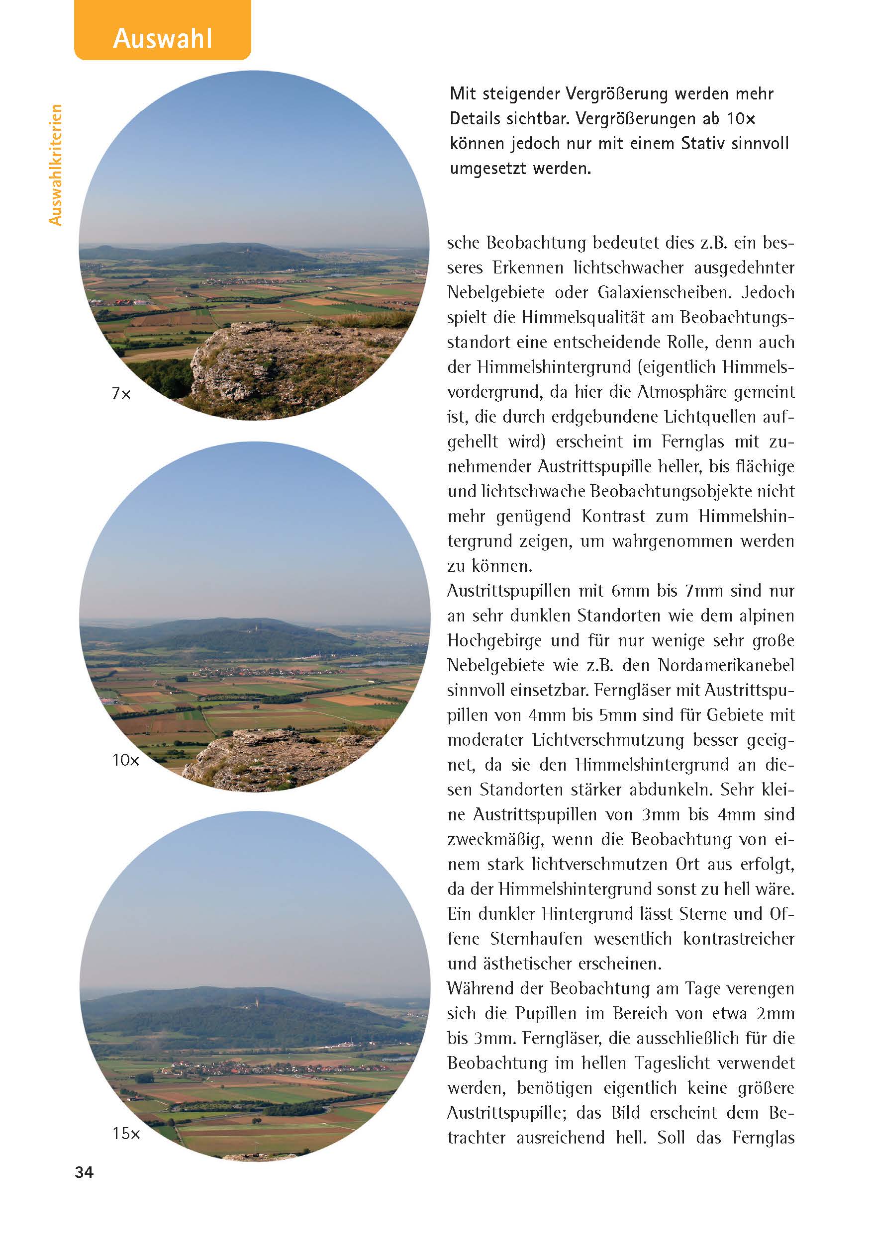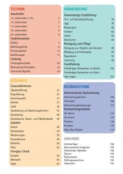 Der zweite Teil des Buches gibt ausführliche Hinweise für den Blick nach oben: Neben der Beobachtung von Mond und Planeten werden die sicheren Methoden der Sonnenbeobachtung erklärt. Daneben werden mehr als zwei Dutzend lohnende Ziele jenseits des Sonnensystems vorgestellt, inklusive realitätsnaher Abbildungen, die die Objekte so zeigen, wie sie im Fernglas sichtbar werden.