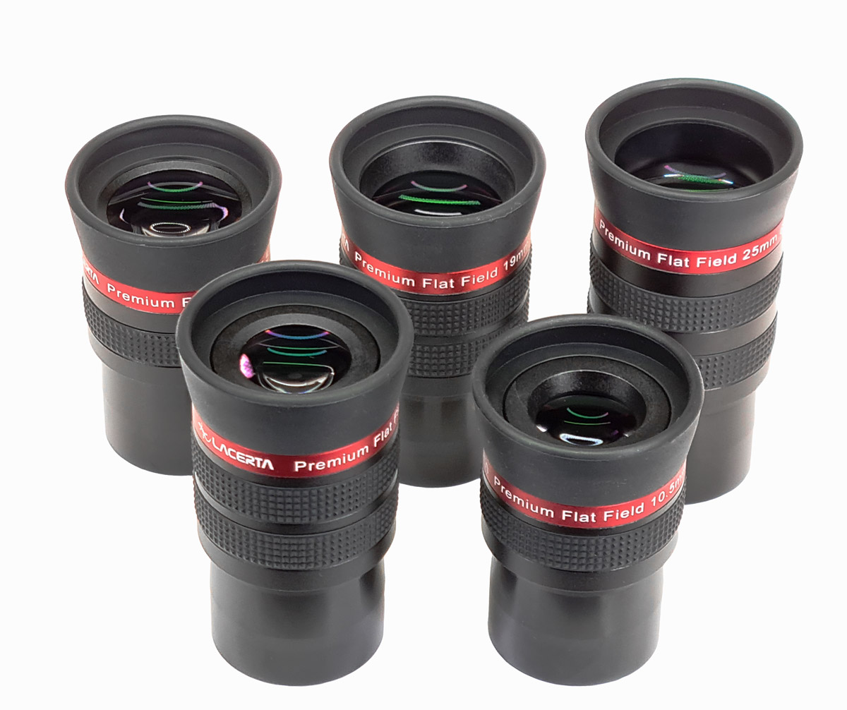 Lacerta Premium Flat Field Okulare bieten ein weites Sehfeld und ein gut korrigiertes Bild zu einem günstigen Preis. Die Mitglieder der Serie sind mit Brennweiten von 25 mm, 19 mm, 15,5 mm, 10,5 mm und 5,5 mm erhältlich.