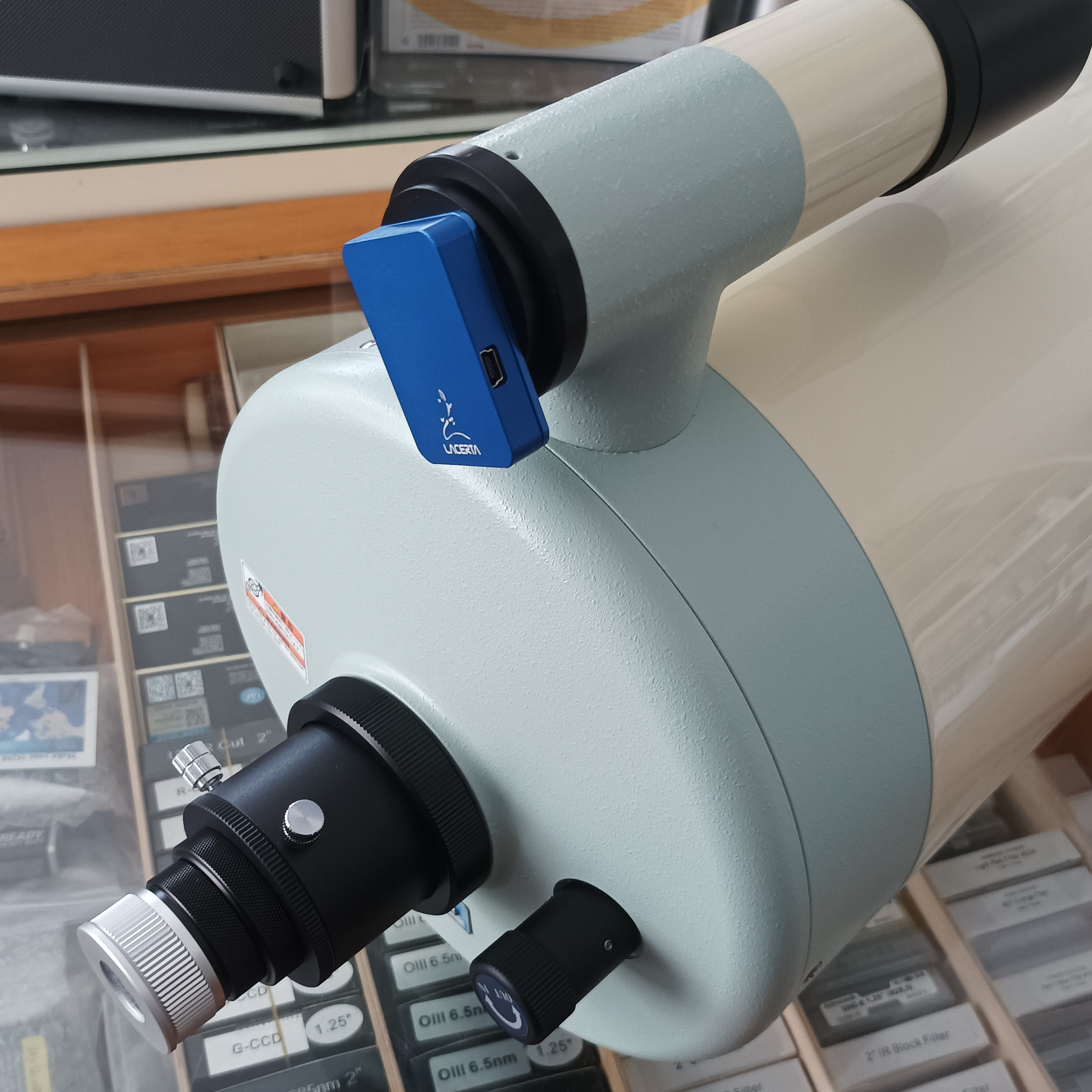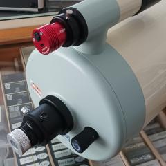 Das Mewlon-250CRS, wie auch das kleinere Mewlon-210 haben hochwertige, fix verbaute 50mm Sucher, die gleichzeitig als Tragegriff dienen. Die spezielle Konstruktion des Okulares samt Strichplatte erlaubte bis jetzt leider keine Montage von anderem Zubehör. Dieser Spezial-Adapter ersetzt das Okular und ermöglicht den Anschluss von Autoguider.