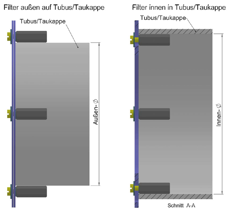Der Filter wird meistens außen auf den Tubus aufgesteckt, damit bleibt die Öffnung der Optik weitgehend erhalten. Es ist aber ebenso möglich den Filter innen in den Tubus einzusetzen.