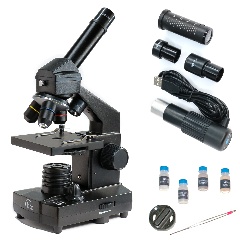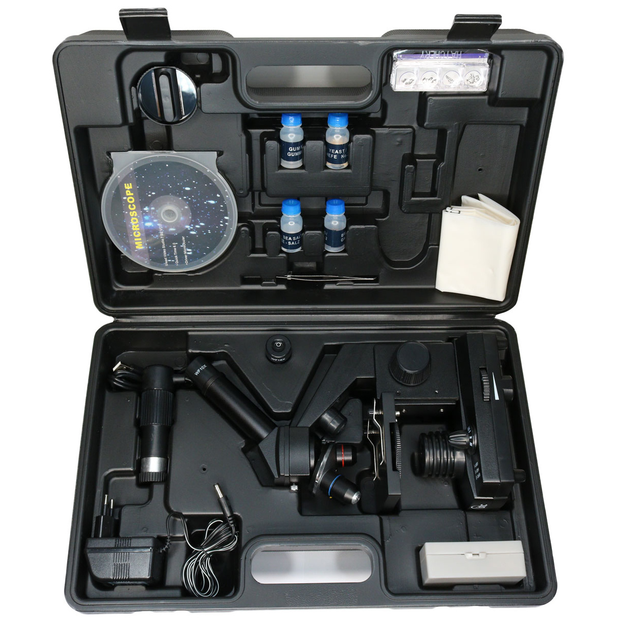 Zusätzlich zum Basismikroskop verfügt das Student-12 Set über eine USB-Kamera, die das angezeigte Bild aufzeichnet (Software-CD enthalten). Ebenfalls enthalten sind 5 vorgefertigte Präparate, 5 leere Objektträger und ein Dünnschnittwerkzeug (sog. Mikrotom). Die Präparate sowie die leeren Objektträger sind in einer verschließbaren Aufbewahrungsbox für 12 Präparate einsortiert. Die Reagenzien (Salz, Klebstoff auf Kautschukbasis, Krebseier usw.), eine Metallklammer und eine Aufbewahrungsbox mit einem Vergrößerungsdeckel mit 4 Fächern helfen bei der Herstellung von Präparaten. Das komplette Paket ist in einem praktischen Kunststoffkoffer verpackt, bei Nichtgebrauch kann das Mikroskop auch aufgebaut mit der mitgelieferten Abdeckfolie geschützt werden.