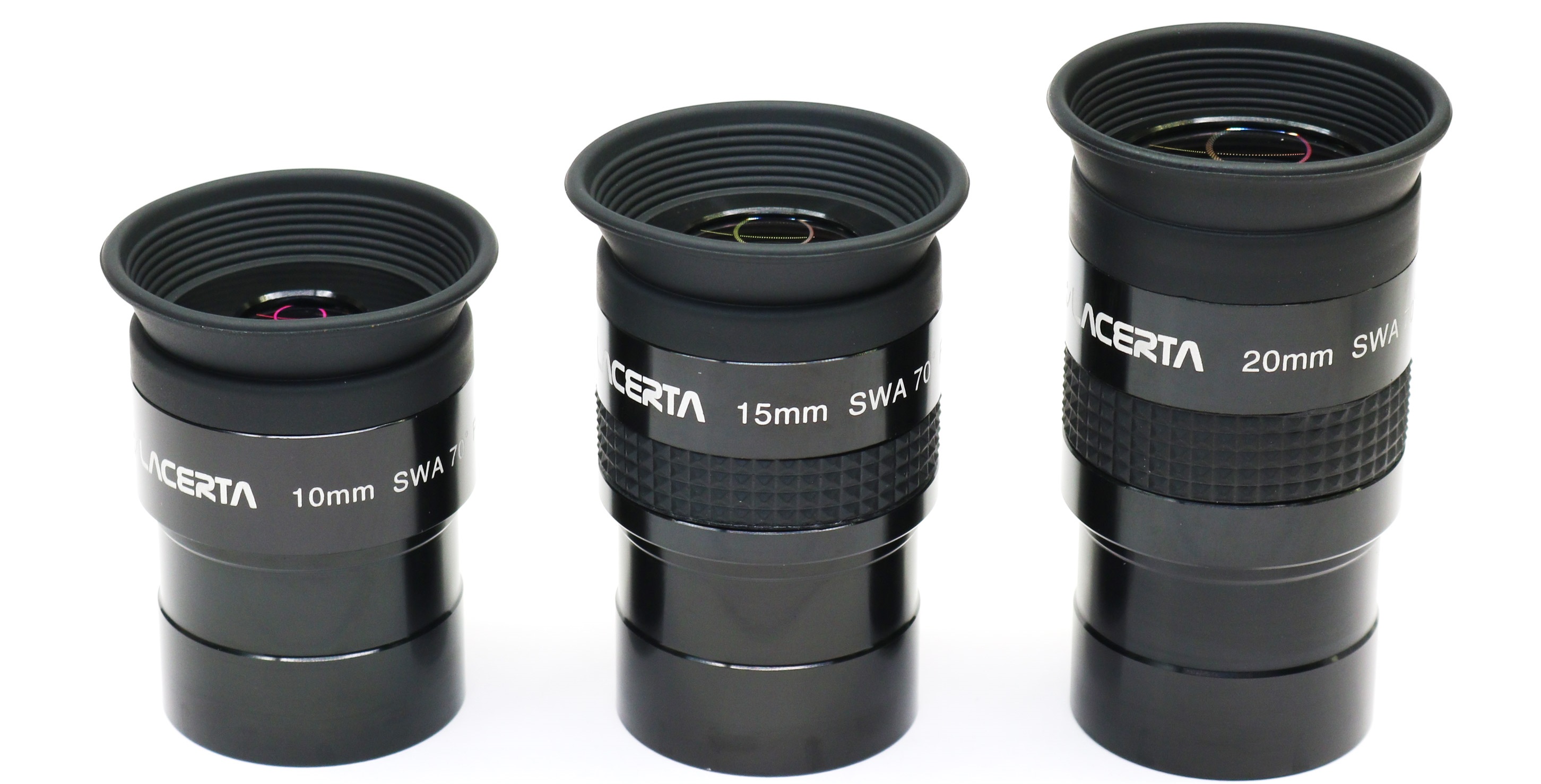 Von Lacerta bieten wir zwei Okularserien für die DeepSky-Beobachtung an. Neben der LUWAN-Serie mit den großen Sehfeldern von 82°, gibt es eine günstigere Serie mit 60-70° Sehfeld als Erfle- bzw. König-Design. Diese Okulare kommen mit weniger Linsen aus, somit punkten sie vor allem bei Transmission und Schärfe.