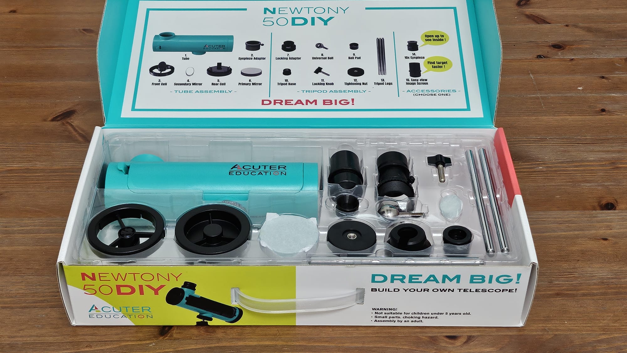 Dieses kleine Newton-Teleskop mit 50 mm Durchmesser ermöglicht die einfache Beobachtung der hellsten Objekte am Himmel. Die abnehmbare Seite ermöglicht uns einen Einblick in das Innere des Teleskops zu werfen und so das Funktionsprinzip von Newtons Spiegelteleskopen studieren können.