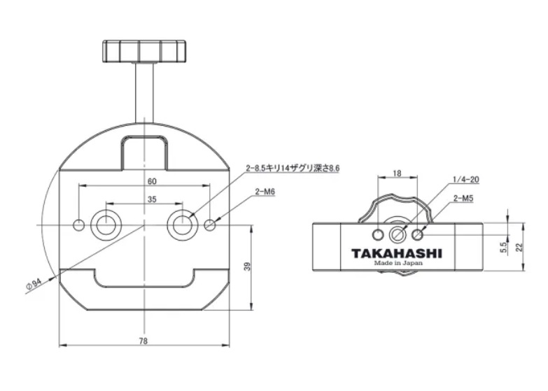 Takahashi Prismenklemme Vixen Level, passend für alle Takahashi-Montierungen rauf bis zur EM-200 (2x M8, 35mm Abstand). Auch für viele Montierungen und Bauteile anderer Hersteller kompatibel.