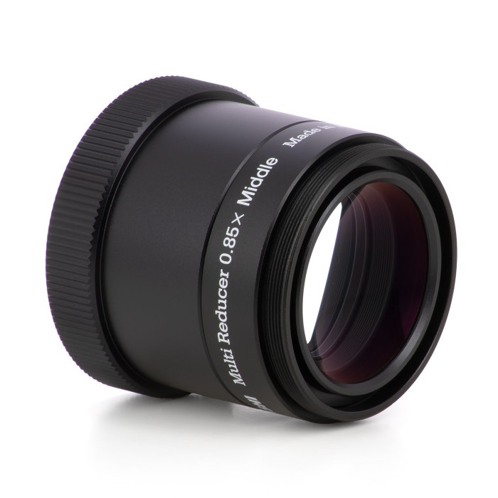 Analog zum Multi-Flattener hat Takahashi einen ähnlich universell einsetzbaren Reducer entwickelt, geeignet für Refraktoren bis 600mm Brennweite. Er ersetzt die bisherigen Reducer der Geräte FS-60C und FC-76D, der auf den ersten Blick etwas geringere Verkürzungsfaktor wird mit kompromissloser Vollformat-Tauglichkeit mehr als kompensiert, die alten Reducer waren nur bis APS-C kompatibel. Die Entwicklung immer hochauflösenderer Sensoren fordert die Verwendung gut korrigierter Optiken mit feiner Sternabbildung über einen großen Bereich, dies wird hier mit einer sehr aufwendigen Konstruktion aus 4 Linsen in 3 Gruppen erreicht.