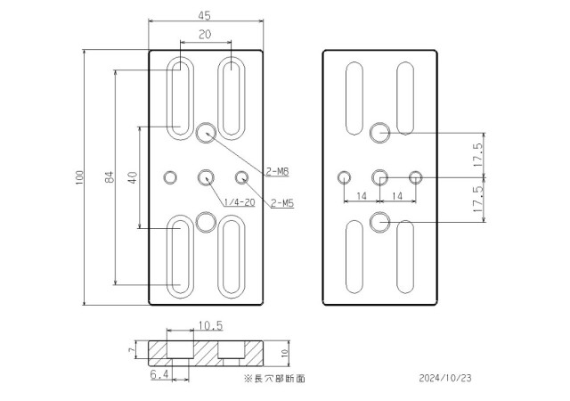 Weiters sind ein zentrales 1/4 Zoll Gewinde, sowie quer 2x M5 vorhanden, Länge der Platte 100mm, Dicke 10mm.