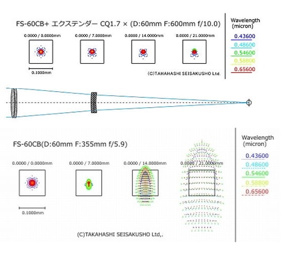 Den kompakten FS-60CB Apo kann man mit diesem 1,7x Q-Modul zu einem 60/600 f/10 Quadruplet Apo aufrüsten. Optisch ist diese Version dem FS-60CB überlegen, das Q-Modul reduziert die sphärische und chromatische Aberration und ebnet zusätzlich auch das Bildfeld, beachten Sie das Spot-Diagramm unten bei den Bildern, oben mit, unten ohne Q-Modul, der Unterschied ist beachtlich. Möchte man den FS-60CB wieder als Richfield-Teleskop verwenden, so entfernt man das Q-Modul wieder, man hat also zwei Teleskope in einem.