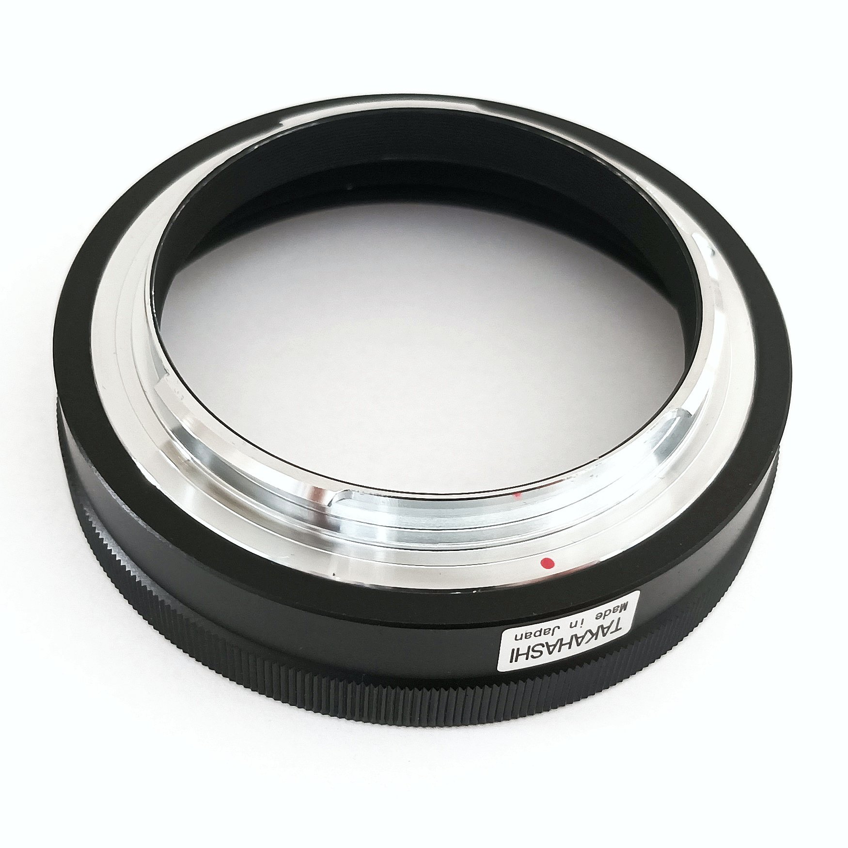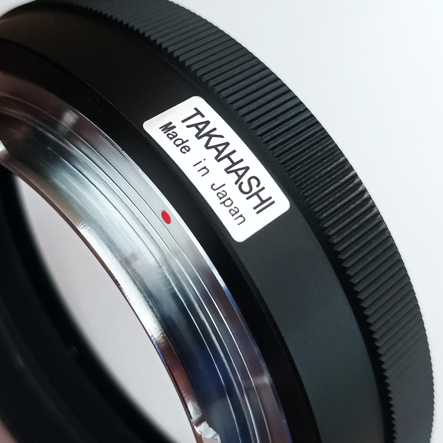 Originaler Takahashi Adapter, hochwertige Ausführung, made in Japan. Wie bei Tak üblich innen mattschwarz ausgeschwärzt, Bajonett aus verchromten Edelstahl. Teleskopseitig M92x1 Innengewinde, Lichtweg 21mm, Außendurchmesser 98mm.