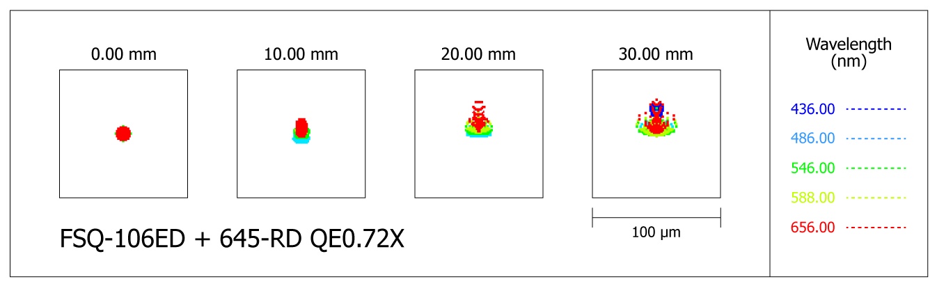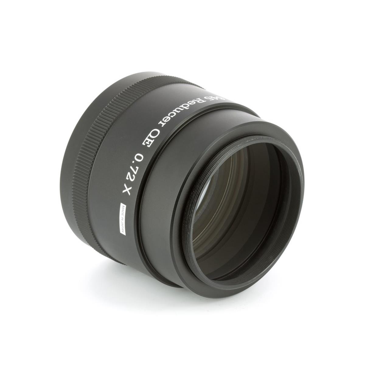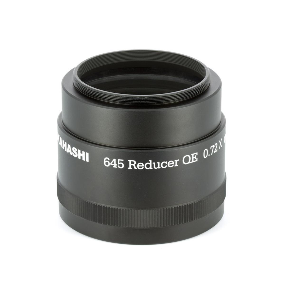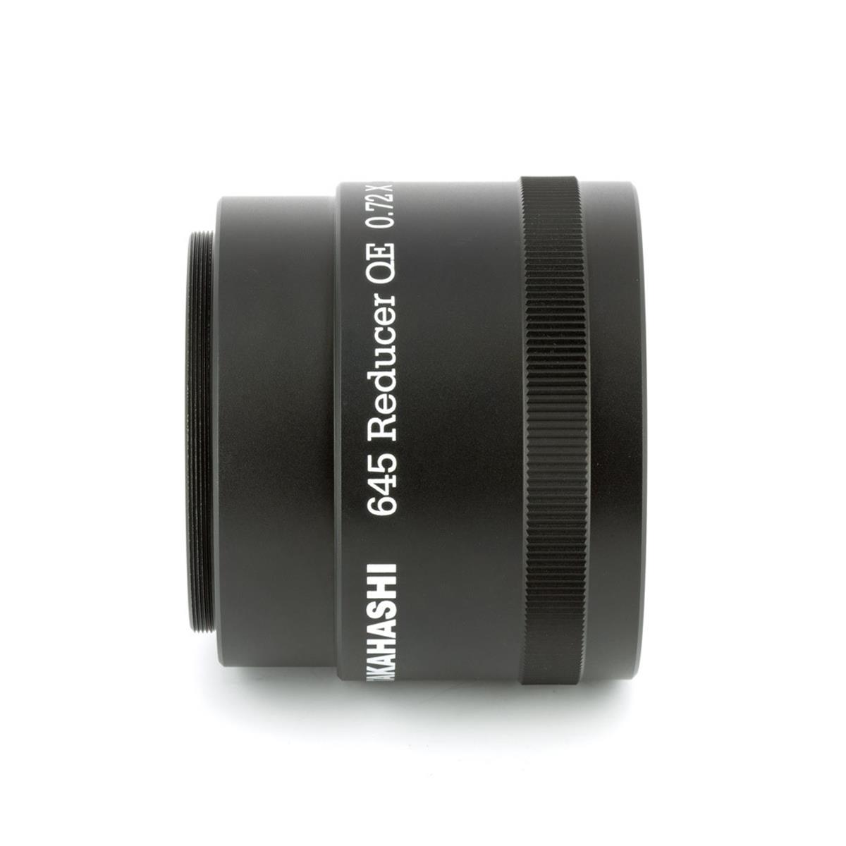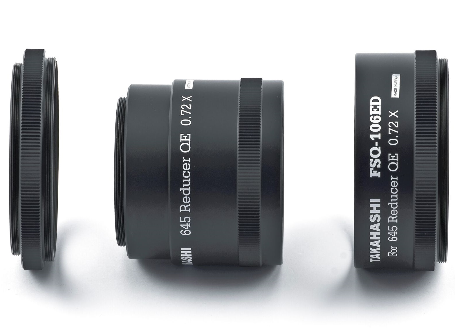 Dieser große Reducer ist speziell für den FSQ-106ED und FSQ-106EDX4 konstruiert und bis zum 6x4,5 Mittelformat geeignet. Er reduziert die Brennweite um den Faktor 0.72x auf lichtstarke 380mm (Blende f/3.6), der optische Aufbau besteht aus 4 Linsen in 4 Gruppen. Er erzeugt einen immens großen Bildkreis von 60mm, das sind bei 380mm Brennweite fast 9° Feld, ein herausragendes Setup! Auch die Ausleuchtung ist extrem gut, bei Vollformat sind das 90%, etwa doppelt so hoch wie beim Reducer-QE 0.73x, selbst am Rand, 30mm abseits der Achse, sind es immer noch 70%!
