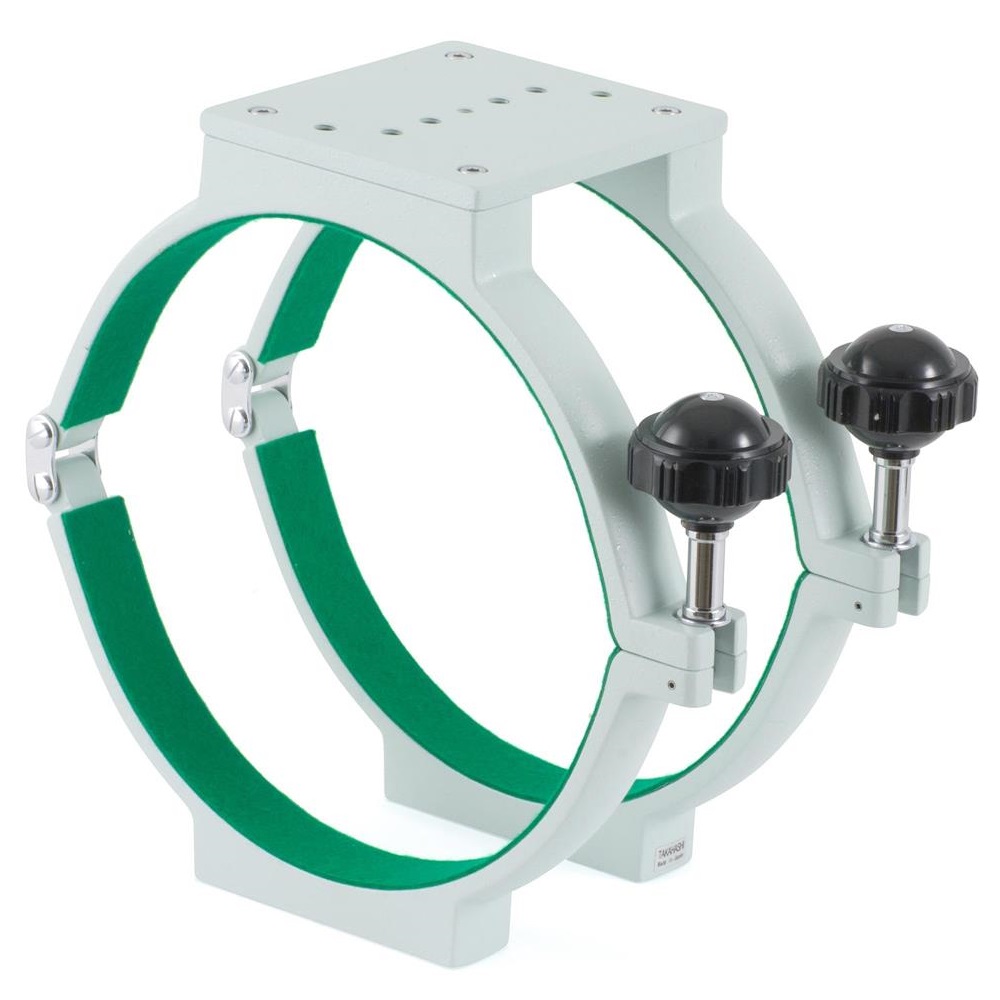 Rohrschellenpaar für den Epsilon-180ED, Durchmesser 232mm, inklusive kurzer Top Plate zur Montage von Leitrohren oder anderem Zubehör. Die hochwertigen Rohrschellen sind sehr massiv, der Tubus wird mit großen, auch mit Handschuhen gut greifbaren Klemmschrauben geklemmt.