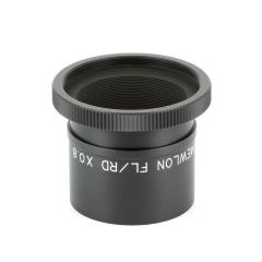 Dieser Reducer verkürzt die Brennweite um den Faktor 0.8x, zusätzlich korrigiert er aber auch das Koma am Bildfeldrand, beim Einsatz der beiden kleineren Mewlon Geräte für DeepSky-Fotografie, ist dieser Korrektor daher sehr zu empfehlen. Die Brennweite wird beim Mewlon-180 auf 1763mm (f/9,8) reduziert, beim Mewlon-210 erreicht man 1961mm (f/9,3). Der Anschluss erfolgt denkbar einfach, fernrohrseitig wird er einfach über 2 Zoll angeschlossen, kameraseitig wird direkt ein Wide T-Mount Bajonettring angeschraubt. Mit dem M54pM48p-Adapter kann über passende Distanzringe auch der Anschluss einer CCD-Kamera erfolgen.