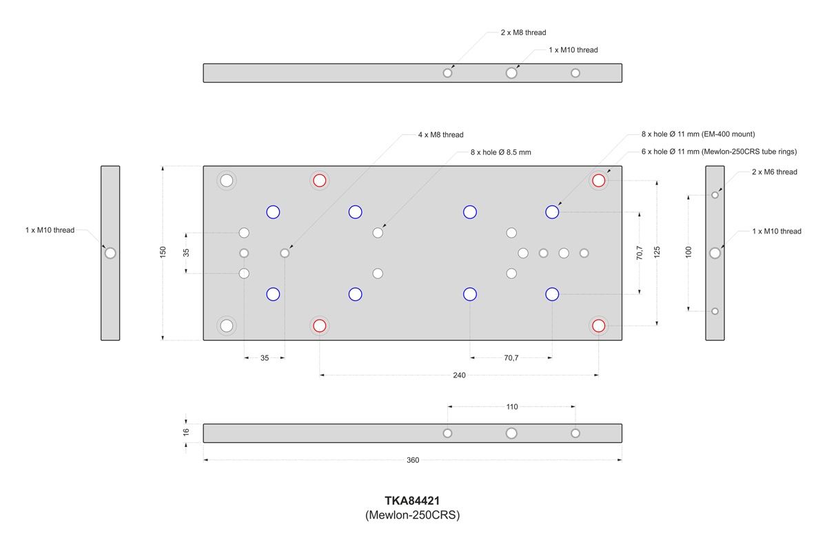 The CW plate is intended for the installation of the Mewlon-250CRS telescope on the Takahashi EM-400, EM-500, JP-Z and NJP mounts.