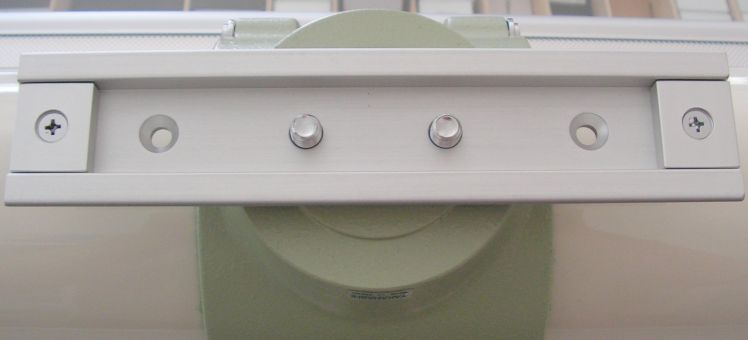 Die Takahashi-Rohrschellen haben an der Unterseite neben einem zentrischen 1/4"-Gewinde, zwei Bohrungen für die Montage. Mit zwei M8-Schrauben kann die Rohrschelle an dieser Schiene befestigt werden, die Schrauben liegen dem Teleskop bzw. der Rohrschelle bei.