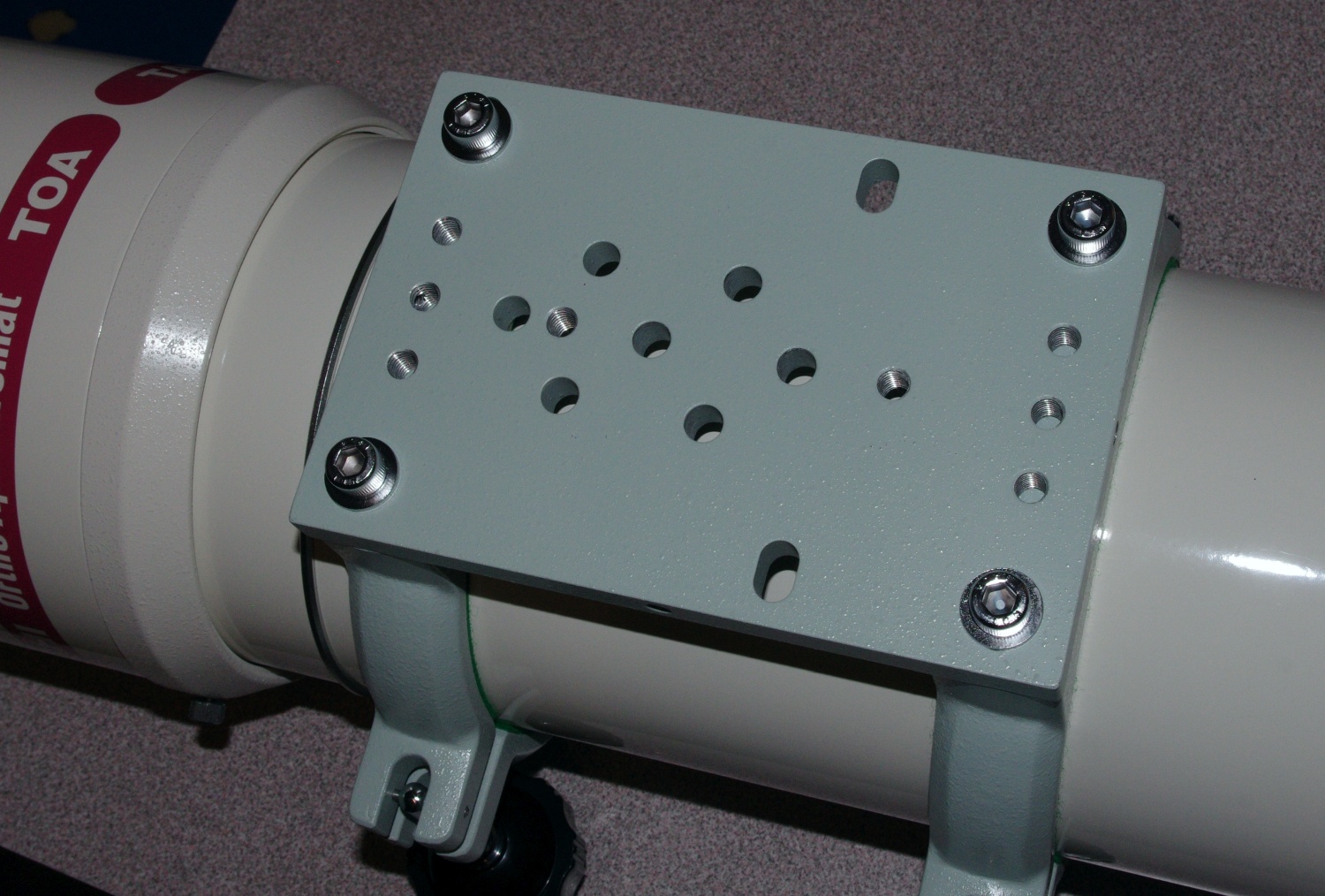 Die Platte passt direkt auf Takahashi Montierungen, sie hat viele Löcher und kann daher vielseitig montiert werden, auch auf anderen Montierungen, jedoch Vorsicht, die Befestigungsschrauben der Rohrschellen sind nicht versenkt und stehen unten über.