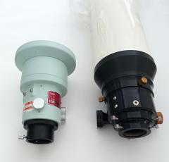 The NS version of the TOA-130 is equipped with a conventional 69 mm diameter rack-and-pinion focuser and a retractable dew shield. A balancing ring is provided to compensate for the weight of the lens cell. In photography, the mounting of the optional TOA-35 FL field corrector offers a consistent image circle of 40 mm. There is also a focal reducer (TOA-35 RD) with a coefficient of 0.7x.