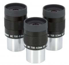 The optical design of the TOE eyepieces consists of 6 lenses divided into 4 groups. The Smyth lens of the first group and the main lens of the last group have been optimised to minimise spherical aberration, chromatic aberration, field curvature and astigmatism. Ghost images and reflections have been reduced, allowing the Moon and planets to be observed with high contrast. Each optical surface is treated with a full multi-layer, broad-spectrum treatment and an alternative treatment is applied to surfaces where the colour balance needs to be corrected and the contrast improved. Finally, all lens edges and internal metal surfaces are blackened to prevent stray rays.