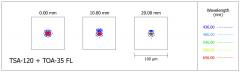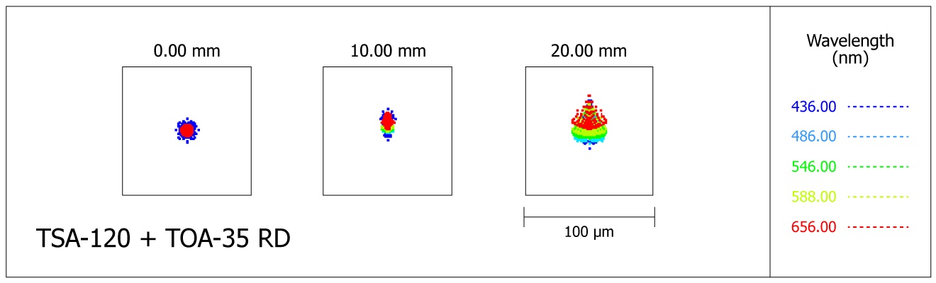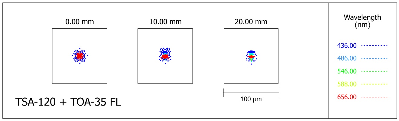 The lens has been designed to achieve a very high level of performance in observation and photography. The chromatic aberration in short wavelengths (blue and violet) is reduced by one third compared to the old FS-102/FS-128 with Fluorite lens. The Strehl ratio at optimal wavelengths of human vision is almost perfect, at 99.2%, equivalent to that of the TOA series.