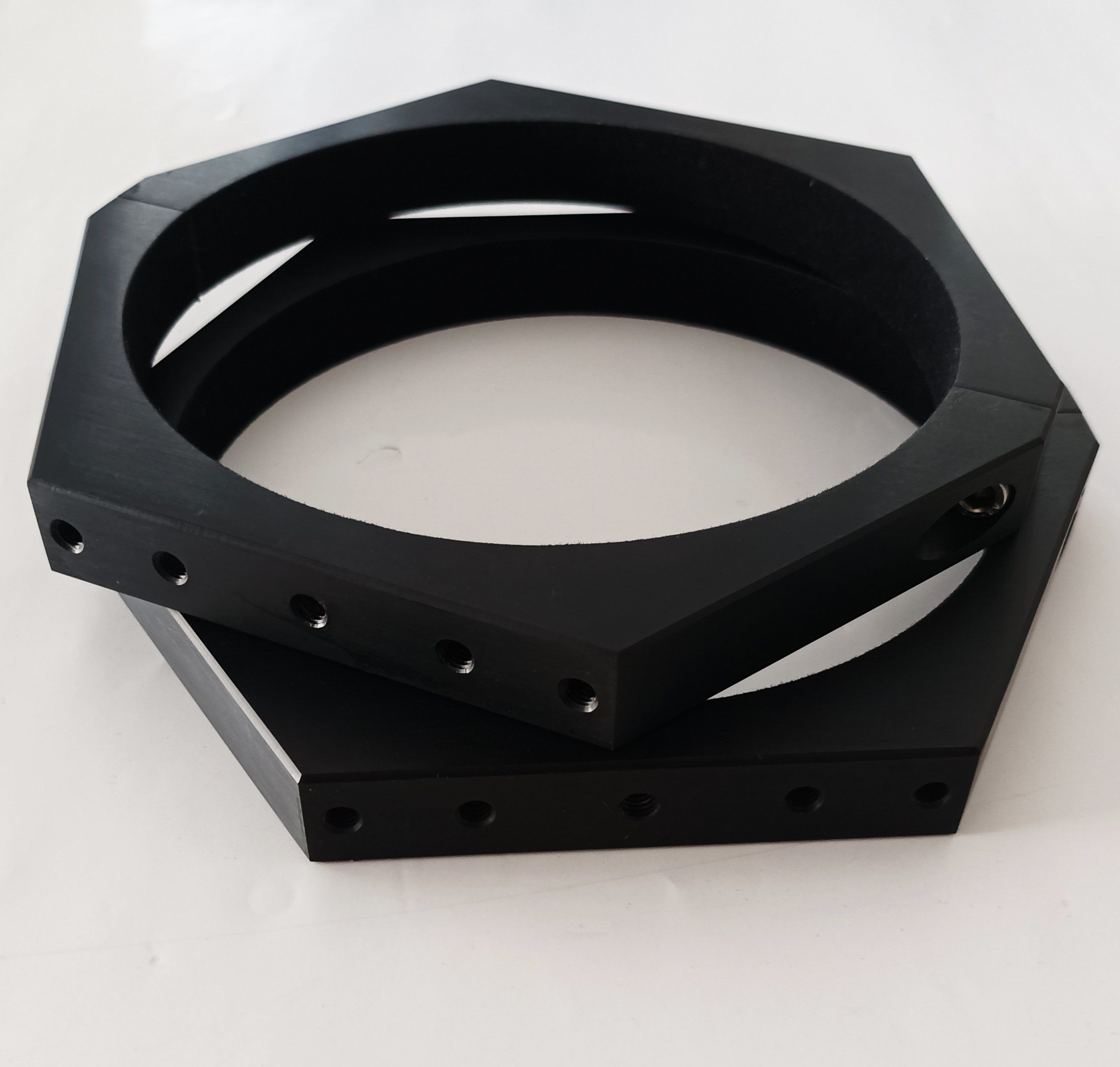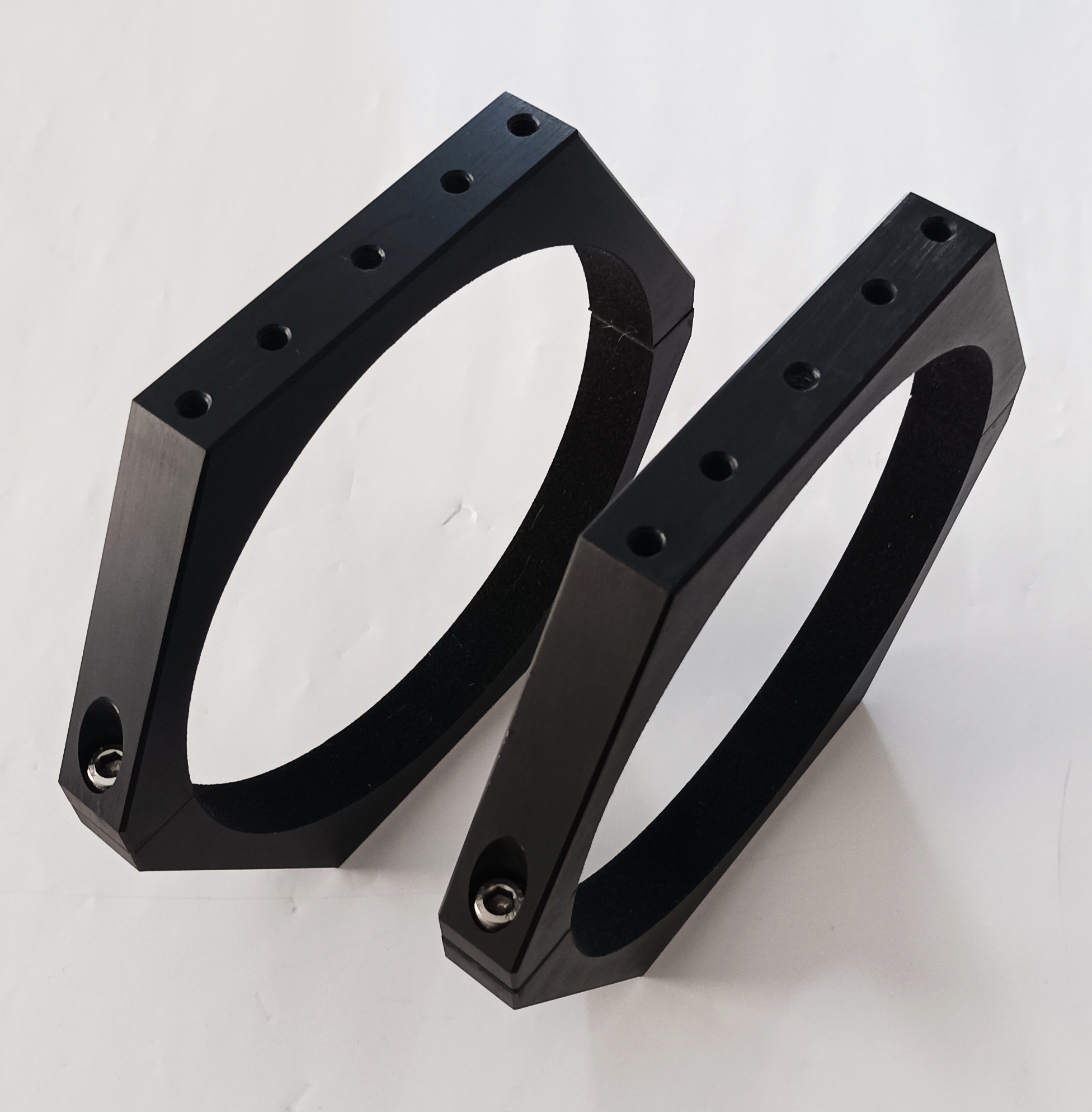 Hochwertige CNC-Rohrschellen in modernem Look, schwarz eloxiert, mit Velour ausgekleidet, mit je 5 M6-Gewinden oben und unten - vielfältige Anbaumöglichkeiten!