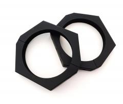 Sechseckige Rohrschellen in modernem Look, schwarz eloxiert, mit Velour ausgekleidet, Breite 15mm, mit mehreren M6-Innengewinden oben und unten.