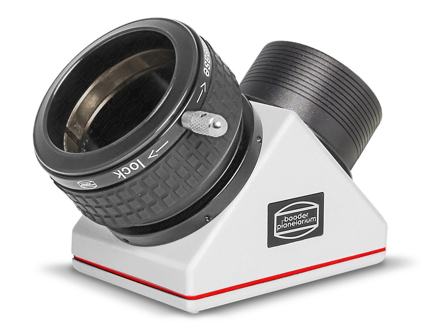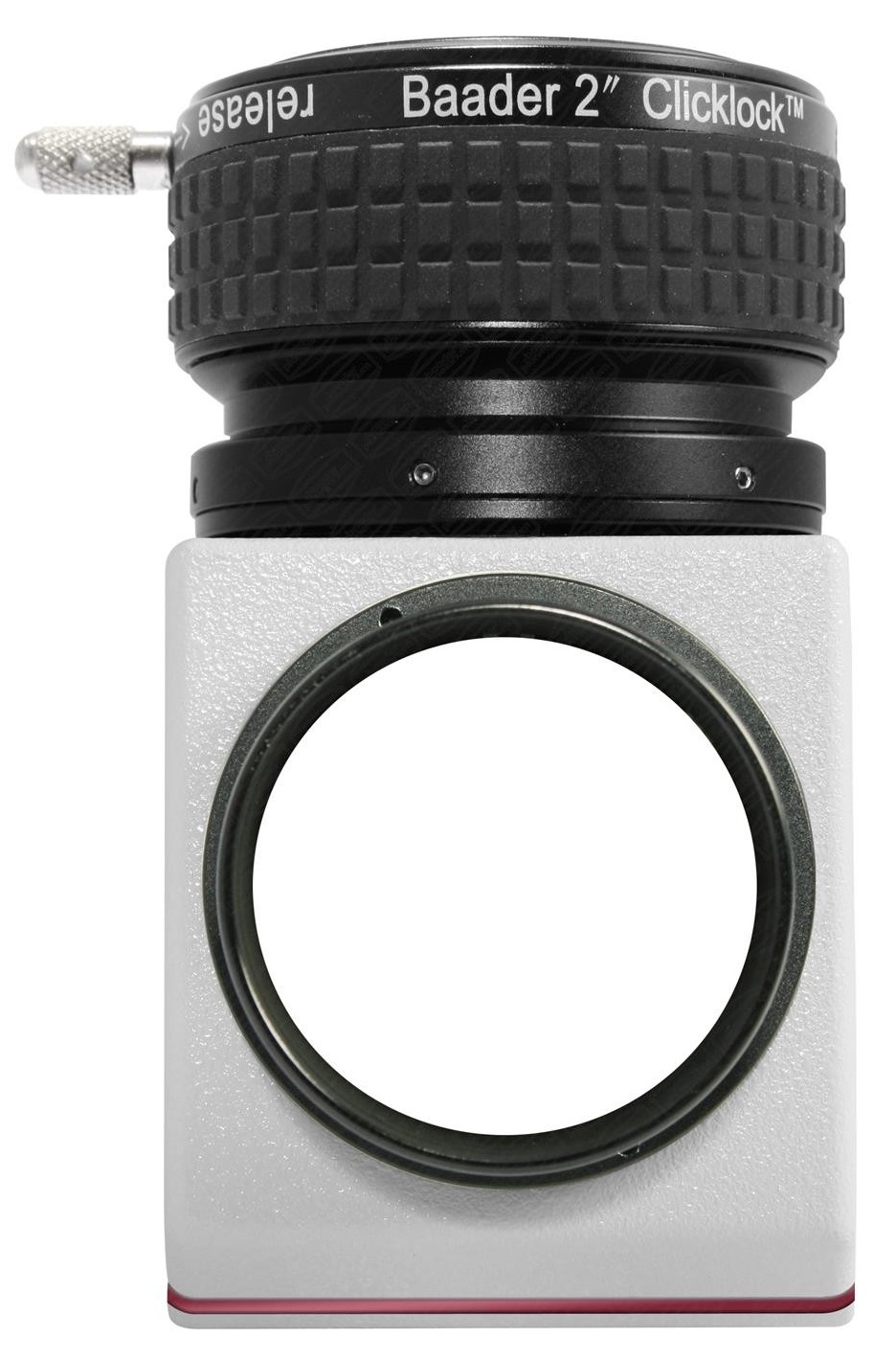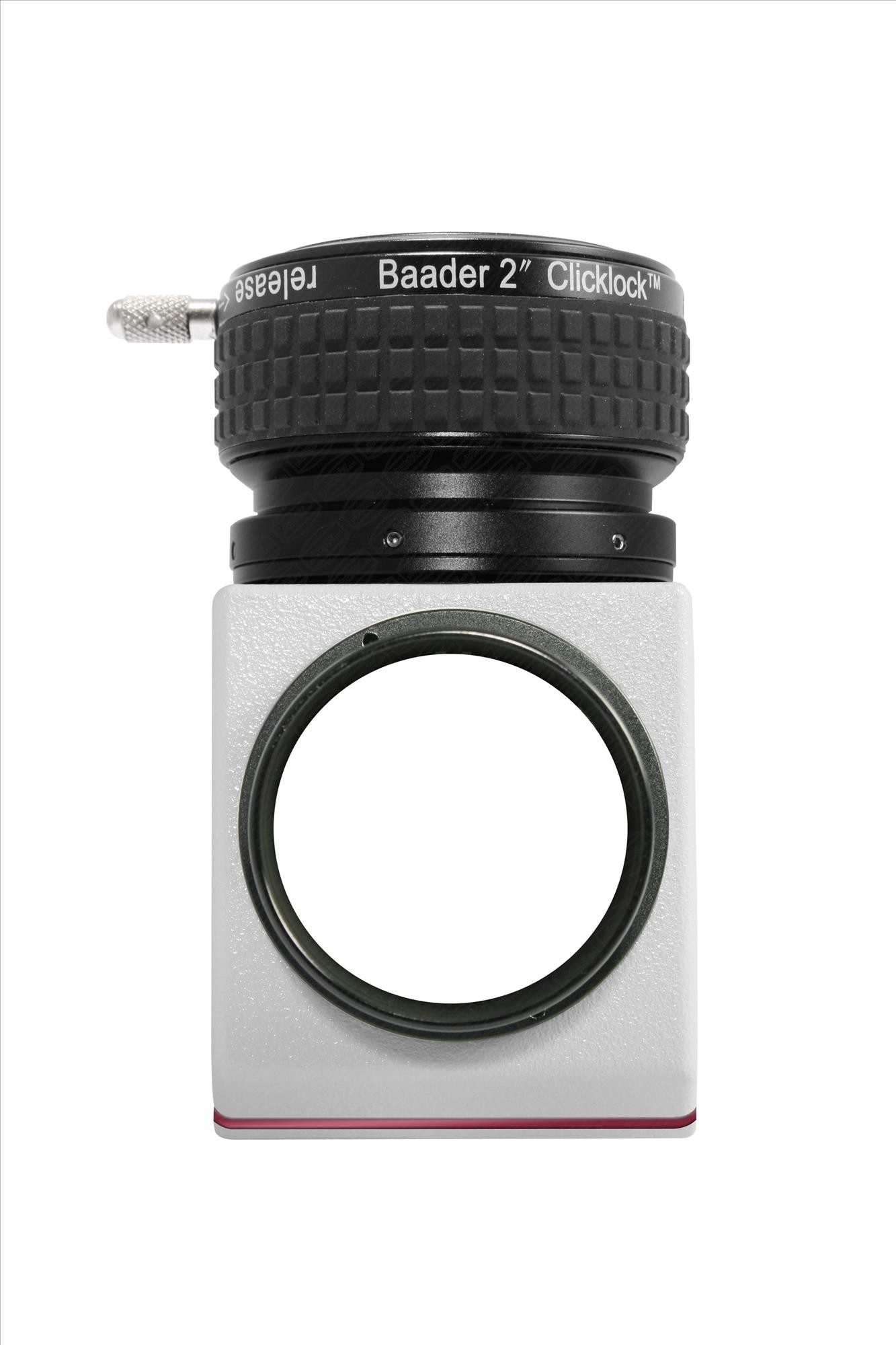 Der Baader 2" ClickLock Zenitspiegel erlaubt zum Beispiel die Aufnahme unseres Hyperion Mark IV Zoom-Okulars, dieses kann direkt auf das Spiegelgehäuse aufgeschraubt werden (dadurch verlängert sich der Scharfstellbereich (= Backfocus) um 47 Millimeter. Die 2"-ClickLock-Klemme wird einfach vom Spiegelgehäuse abgeschraubt (durch Lösen der sechs seitlichen Klemmschrauben M2.5). Oben am Gehäuse wird dadurch ein 2Zoll-Innengewinde zugänglich. Dorthinein wird ein Übergangsring von 2Zoll weiblich auf 2Zoll männlich eingeschraubt (Baader 2"i auf 2"a Umkehrring # 1508020). An diesen Umkehrring kann das Mark IV Zoom-Okular direkt fest angeschraubt werden.