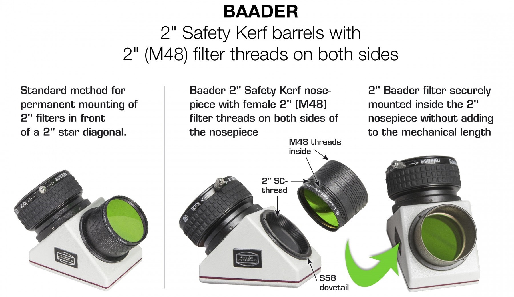 • Abnehmbare 2" Safety Kerf Steckhülse, beide Enden der Steckhülse sind mit M48-Filtergewinden ausgestattet und bieten größtmögliche freie Öffnung für Weitfeld-Beobachtung